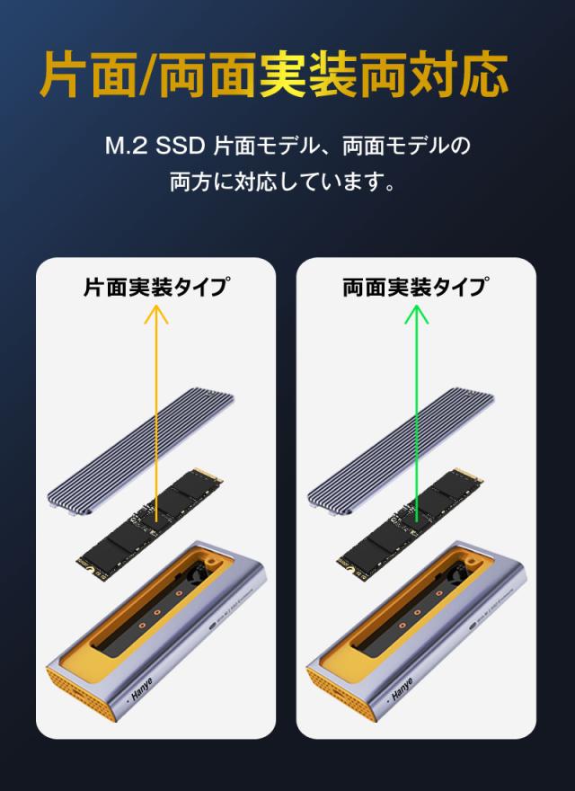 この外付けケースは、M.2 SSDの片面モデルと両面モデルの両方に対応しています。