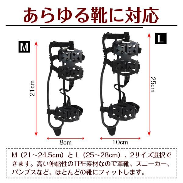 雪道などの滑り止め防止や、凍結対策に重宝する靴底用滑り止めスパイクです。熱可塑性エラストマー(TPE)製なので靴の上から引き伸ばして取り付けることができます。スパイク部分は耐久性のあるニッケル鋼を使用!雪道、圧雪、凍結道路に。山菜採り、草刈り、レジャー用に。長靴からスニーカーまで装着可能です、24本爪のアイゼン仕様で滑りやすい路面をがっちりグリップ。軽くコンパクトなので携帯にも便利です。いつでもどこでも簡単に装着できます。