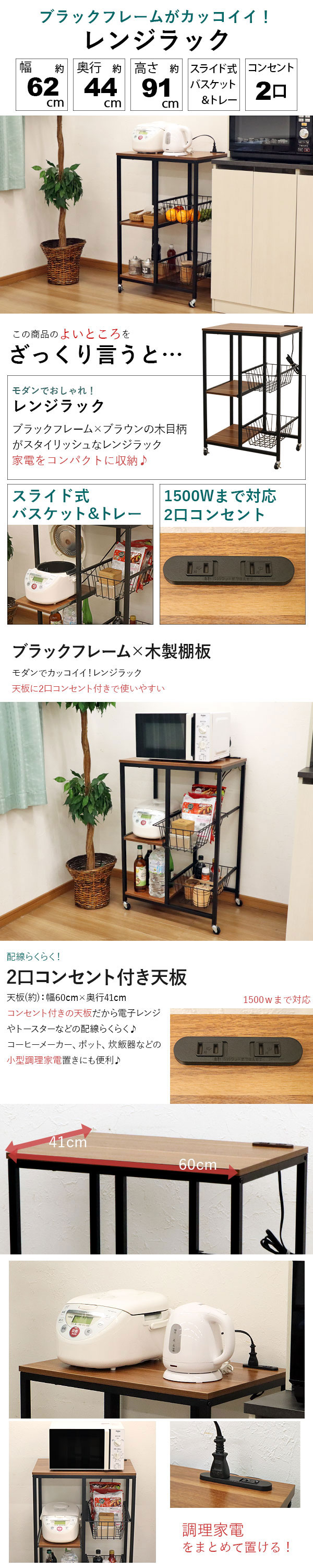 商品名:レンジラック コンセント付き キャスター付き ヴィンテージ風 ブラックアイアン風 北欧風 幅61.5cm 奥行44cm 高さ91.2cm レンジ台 おしゃれ レンジボード サイドボード スチールワゴン キャスターワゴン サイドワゴン スライド棚 バスケット 一人暮らし キッチン 木目調 インテリア 収納家具 キッチン収納 キッチンストッカー 家電収納ラック 炊飯器 オーブントースター 電気ポット 電気ケトル コーヒーメーカー デスクサイド ラック ランドリー スライドトレー スライドバスケット 2口コンセント オープンラック キッチンボード ワンルーム リビング ブラックスチール 黒脚 インダストリアル風 アンティーク風 モダン シンプル かっこいい かわいい スタイリッシュ 水に強い 汚れに強い ブラウン ブラック 茶色 黒