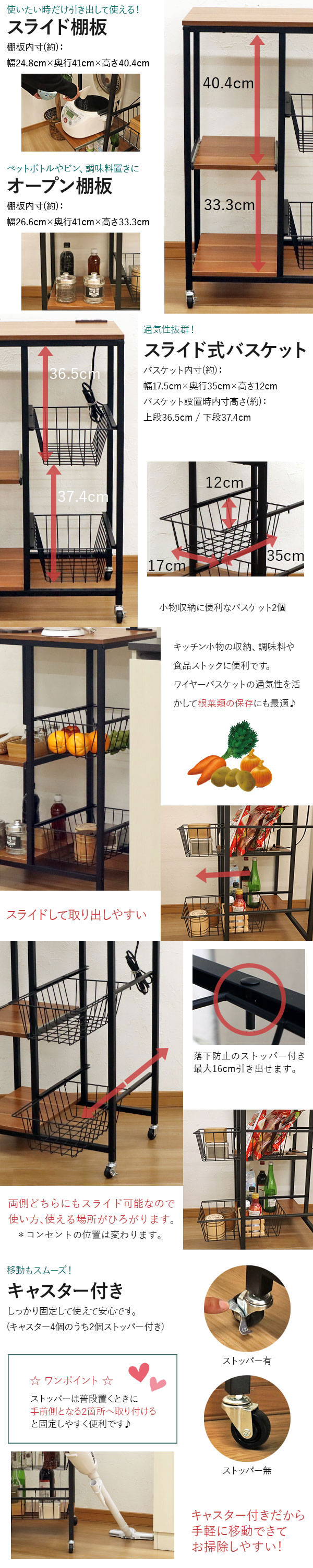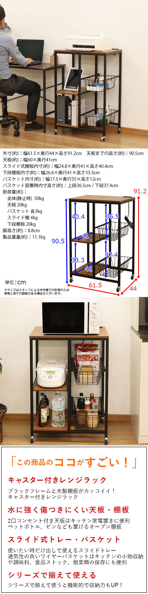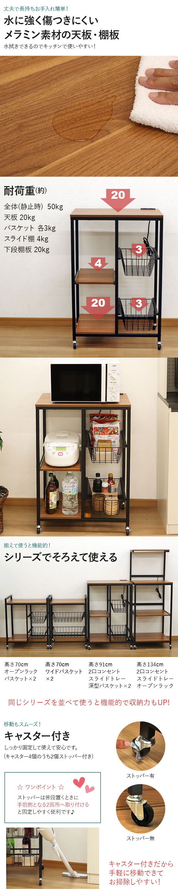 耐荷重(約):全体(静止時) 50kg / 天板 20kg / バスケット 各3kg / スライド棚 4kg / 下段棚板 20kg