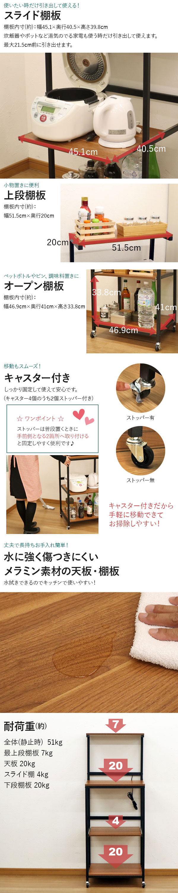 耐荷重(約):全体(静止時) 51kg / 最上段棚板 7kg / 天板 20kg / スライド棚 4kg / 下段棚板 20kg