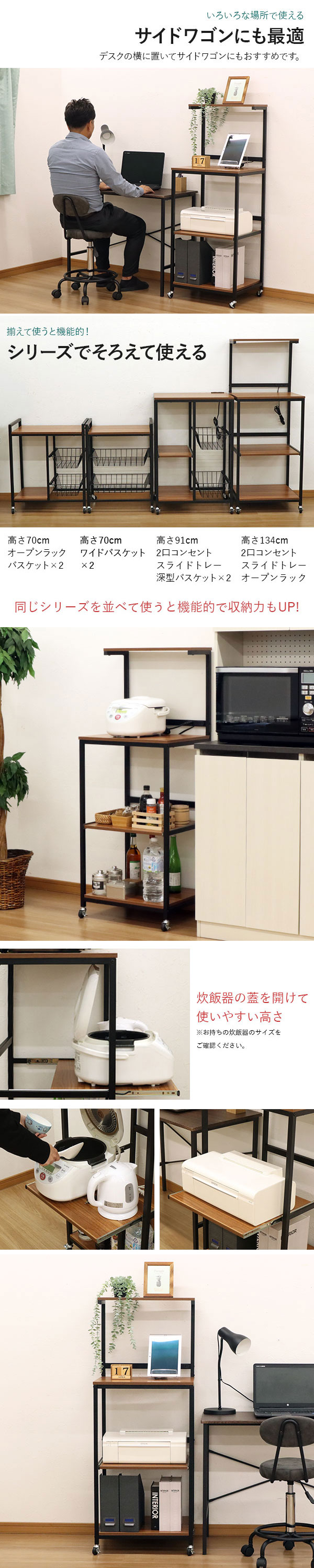 商品名:レンジラック コンセント付き キャスター付き ヴィンテージ風 ブラックアイアン風 北欧風 幅61.5cm 奥行44cm 高さ91.2cm レンジ台 おしゃれ レンジボード サイドボード スチールワゴン キャスターワゴン サイドワゴン スライド棚 バスケット 一人暮らし キッチン 木目調 インテリア 収納家具 キッチン収納 キッチンストッカー 家電収納ラック 炊飯器 オーブントースター 電気ポット 電気ケトル コーヒーメーカー デスクサイド ラック ランドリー スライドトレー スライドバスケット 2口コンセント オープンラック キッチンボード ワンルーム リビング ブラックスチール 黒脚 インダストリアル風 アンティーク風 モダン シンプル かっこいい かわいい スタイリッシュ 水に強い 汚れに強い ブラウン ブラック 茶色 黒