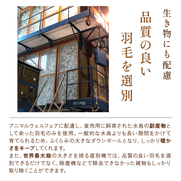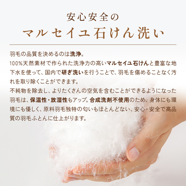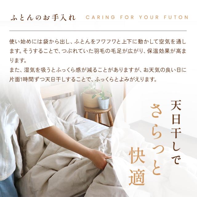 【使い方と注意】 どんな小さな穴でも羽毛が飛び出しますので、絶対に針や安全ピンで襟カバーなどをつけないでください。 ふとん側生地の傷みや汚れを防ぐため、カバーやシーツを掛けてお使いください。 日に干すか、ふとん乾燥機をご使用ください。暖かさ、かさ高、弾力が増し、使い心地がよくなります。 縫い目などから羽毛が出てくることがありますが、少量の場合は使用上問題はありません。 臭いがしたら、ふとんを折りたたんで臭気を押し出し、新しい空気と入れ替えて、3〜4時間日に干してからお使いください。 【干し方】 天日干しによる色褪せが気になる場合は、カバーやシーツでおおって干してください。 全面が日に当たるように両面を干してください。 午前10時から午後3時ごろまでに片面2時間くらい、天気のよい乾燥した日に干してください。 ふとん叩き等で叩かないでください。 強く叩きますと側生地や詰め物を傷める恐れがあります。 【収納と保管の仕方】 湿気の少ない場所に収納してください。 しばらく使わないときは、一度日に干してから、カバーやシーツを外し保管してください。 ダニやカビを防ぐため、使わない間でも、ふとんは時々日に干し、収納場所も乾燥してください。 【洗い方】 部分的に側生地が汚れたら、すぐにつまみ洗いし、十分に乾燥してください。 洗濯機を使用する際は、製品紹介画像に記載している注意事項をお読みの上、ネットを使用し、やさしいコースで洗濯してください。 洗濯後は、天日干しか、大型タンブルを30分程度使用して、中までしっかり乾燥させてください。 専門店でのクリーニングは業者に相談してください。 |
