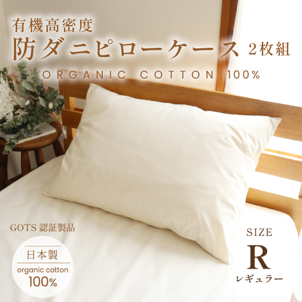 【ダニ通過0%】薬剤不使用 有機高密度防ダニピローケース(枕カバー)レギュラー2枚組 オーガニックコットン100% 日本製 綿100% 有機認証取得 安心安全 無染色 無漂白 無添加 無地 キナリ 生成色 シンプル ナチュラル 普通サイズまくら用 片側ファスナー付き