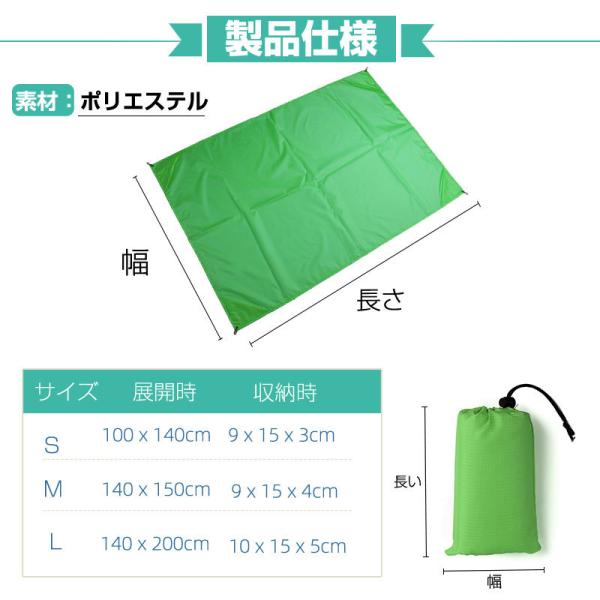 | サイズ | S:展開時--100x140cm 収納時--9x15x3cm; M:展開時--140x150cm 収納時--9x15x4cm ; L:展開時--140x200cm 収納時--10x15x5cm ; |