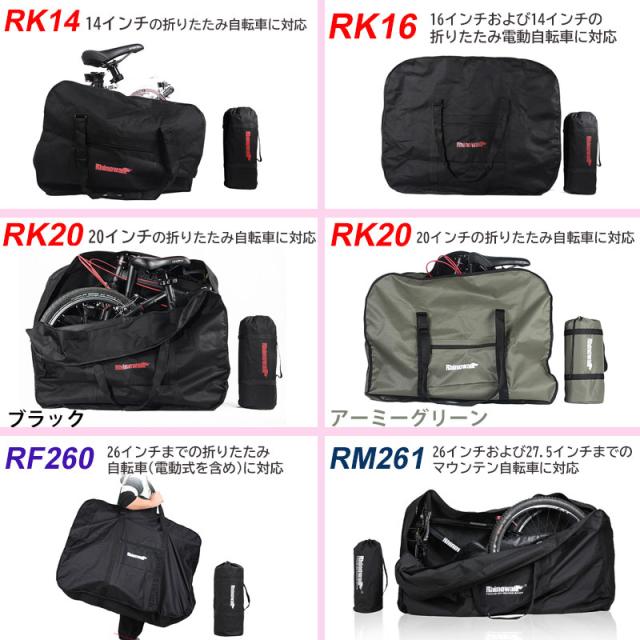 | サイズ | RK14 長さ68cmX幅30cmX高さ62cm 14インチの折りたたみ自転車に対応 収納袋(収納サイズ:長さ28cm×14cm) RK16 長さ75cm X幅40cmX高さ65cm 16インチおよび14インチの折りたたみ電動自転車に対応 収納袋(収納サイズ:長さ28cm×14cm) RK20 長さ83cmX幅33cmX高さ69cm 20インチの折りたたみ自転車に対応 収納袋(収納サイズ:長さ32cm×15cm) RF260 長さ98cmX幅40cmX高さ80cm 26インチまでの折りたたみ自転車(電動式を含め)に対応 収納袋(収納サイズ:長さ40cm×16cm) RM261 長さ140cmX幅28cmX高さ80cm 26インチおよび27.5インチまでのマウンテン自転車に対応 収納袋(収納サイズ:長さ40cm×19cm) |