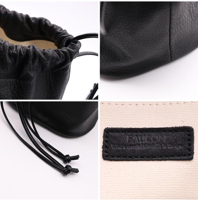 | HawkCompanyの革のブランド、FAUCON(フォコン)の上質で厳選された素材、無骨で気の利いたディテール、シンプルなレザーの巾着タイプのバッグです。キャンバスとレザーの両面を楽しめるリバーシブル仕様。丸みのあるフォルムで、中にロゴのプリントされていることが特徴です。長いドローコードはサコッシュやミニショルダーバッグのようにたすき掛けにするのもあり、ループに手首を通してサラッと持つのもおすすめです。 |