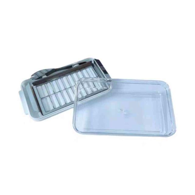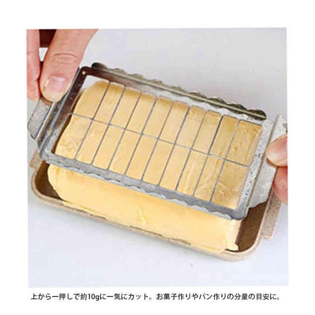 | バターを均等な分量にカットできて、そのまま冷蔵庫保存できるバターケースです。 上から一押しで約10gに一気にカット。お菓子作りやパン作りの分量の目安に。 土台の上にバターを置きます。ガイドに沿ってカッターを乗せ、両手でカッターをすーっと押し込むだけ! フタをして残りは冷蔵庫に入れて保存できます。 バターカッターとバターナイフはケース内に収納できるので、保管にも便利。 ※冷蔵庫から取り出したばかりの硬いバターへの使用は避けて、30〜60分常温に戻してからカットすると、キレイに切れます。 | |