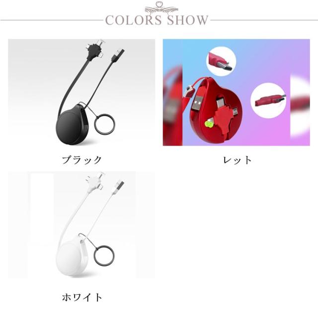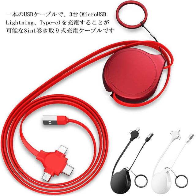 3in1 iOS / Micro USB / USB Type-C 巻き取り ホルダー ケーブルライトニングケーブル 携帯便利 microusb typec スマホ 充電ケーブル iPhone Android Xperia AQUOS