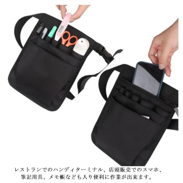 | 看護士、介護士の方など、手にバッグを持てない作業をする時に非常に役立ちます。 機能性に優れたエプロンバッグです。 レストランでのハンディターミナル、店頭販売でのスマホ、筆記用具、メモ帳なども入り便利に作業が出来ます。 ペン・カッター・メジャーなどの小物道具も収納できるので仕事がスムーズになります。 取り付け、取り外しが簡単なワンタッチのバックルにて脱着が出来ます。 | |