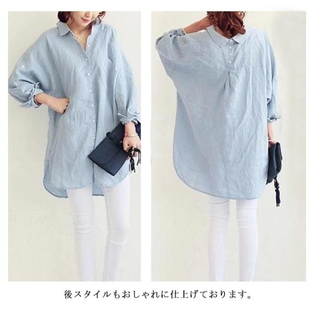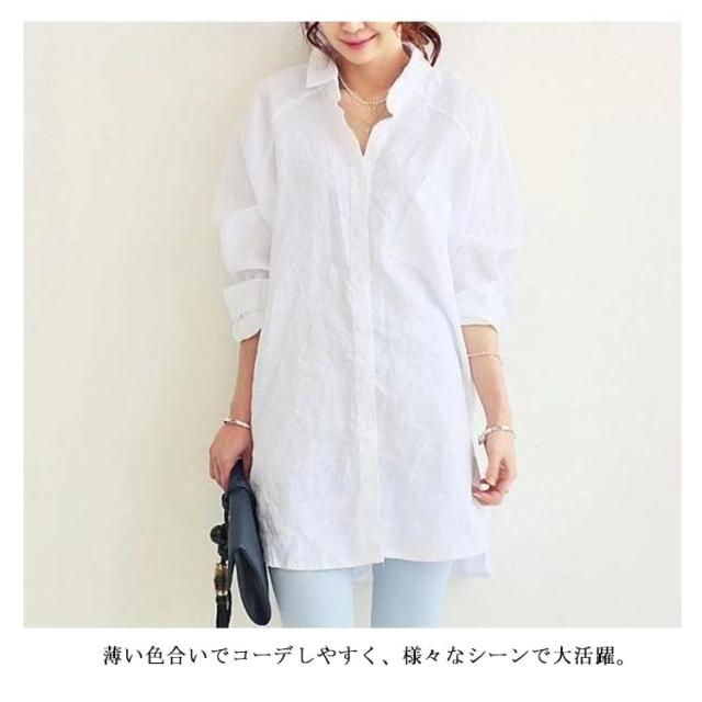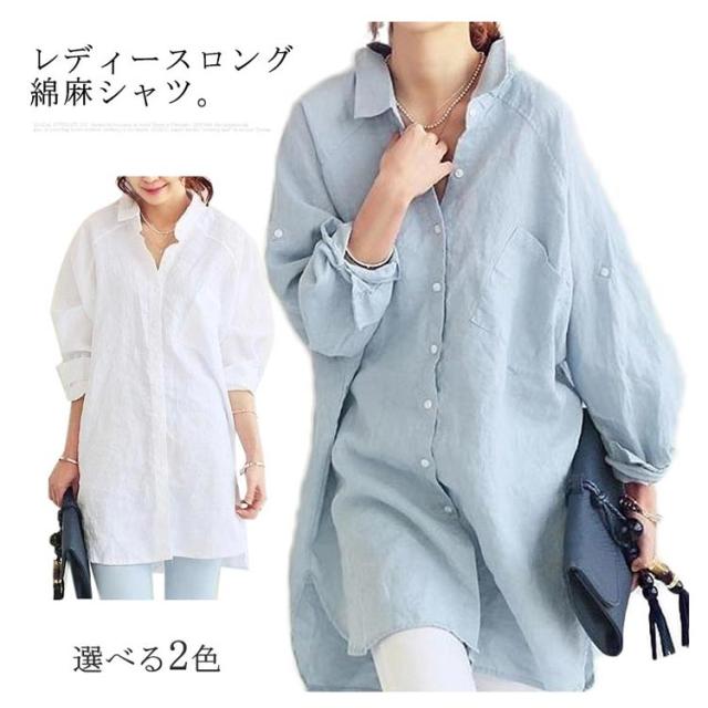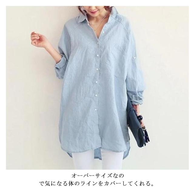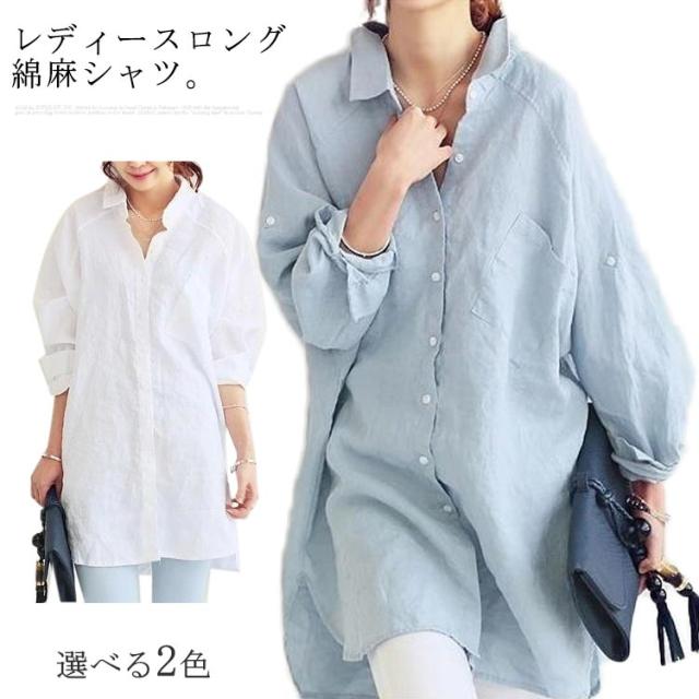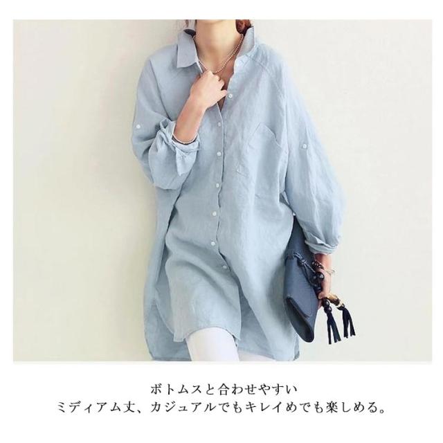 ブラウス シャツ 綿麻シャツ ロング丈 レディース 長袖 無地 とろみシャツ リネンシャツ ビッグシルエット チュニック ナチュラル 森ガール系 ロールアップ袖 大きいサイズ 春 夏 秋 送料無料