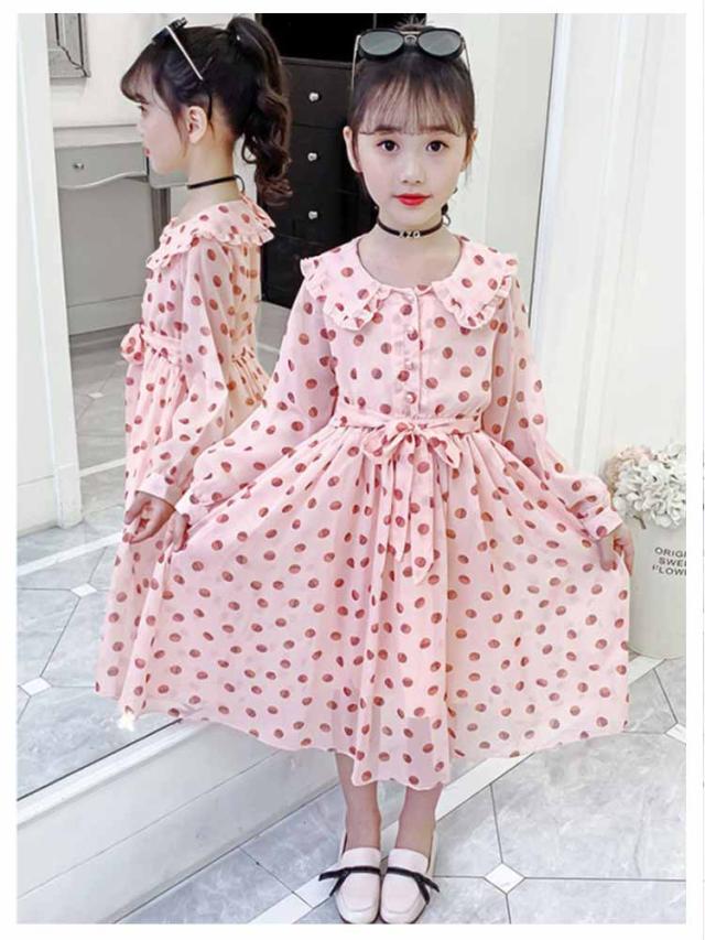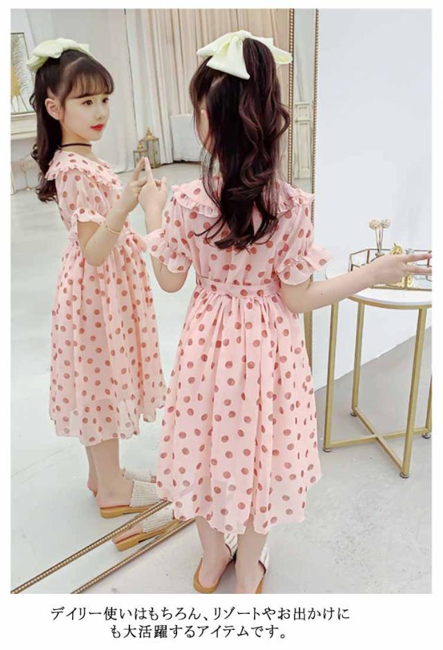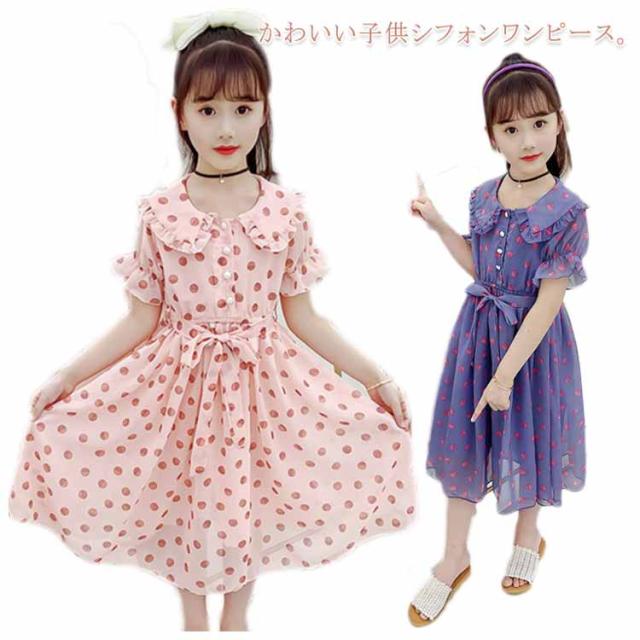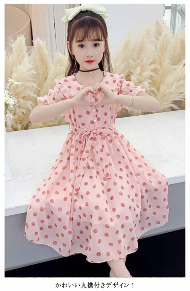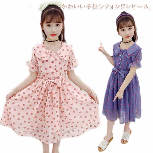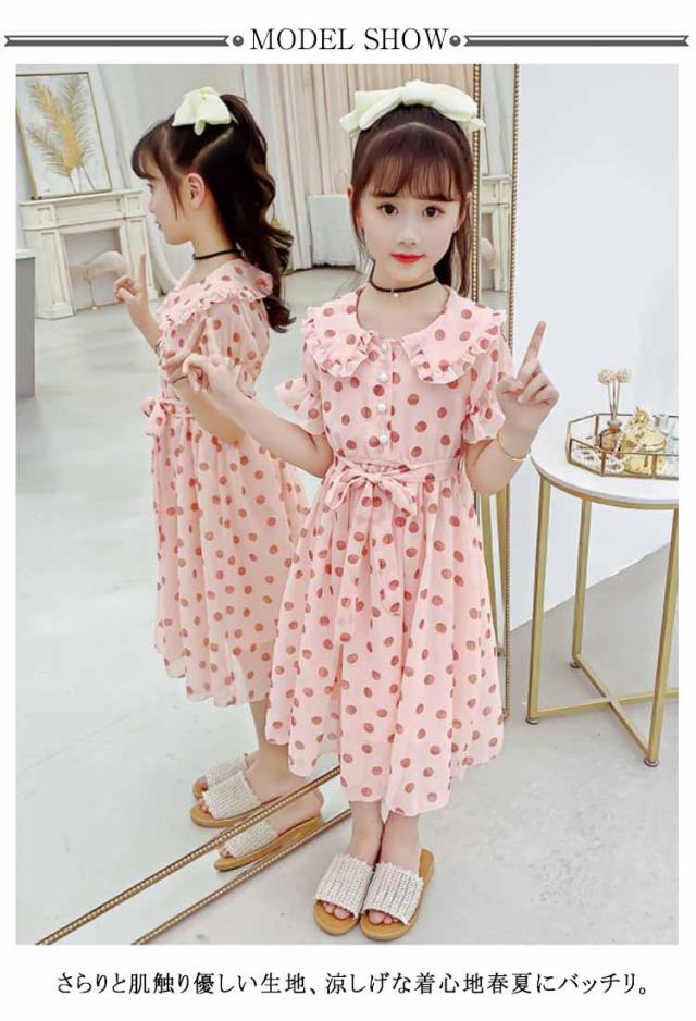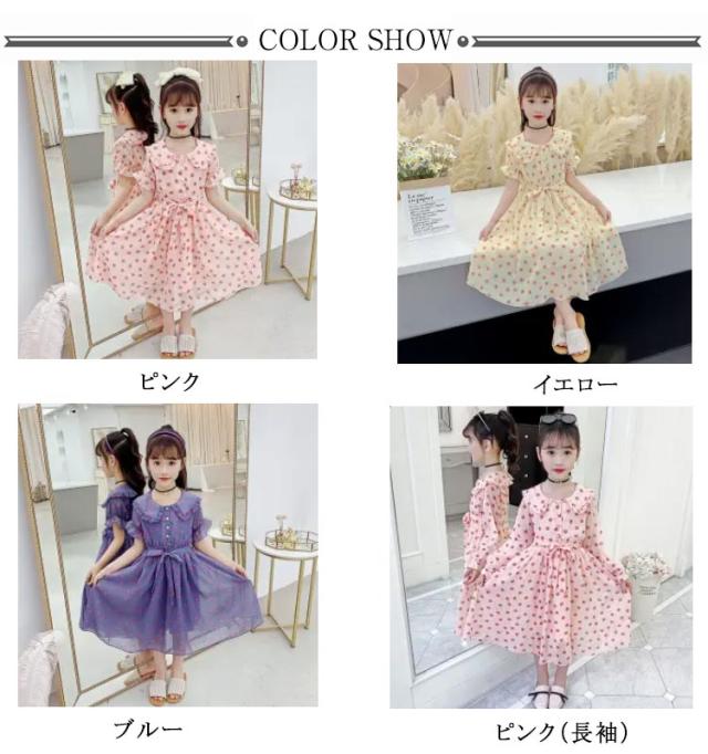 ワンピース 女の子 キッズ 2タイプ シフォンワンピース 春 夏 子供服 半袖 長袖 マキシ丈 ロング丈 ハイウェスト 丸襟付き リボン ドット柄 フレアワンピース 無地 ジュニア 普段着 カジュアル 送料無料 110 120 130 140 150 160
