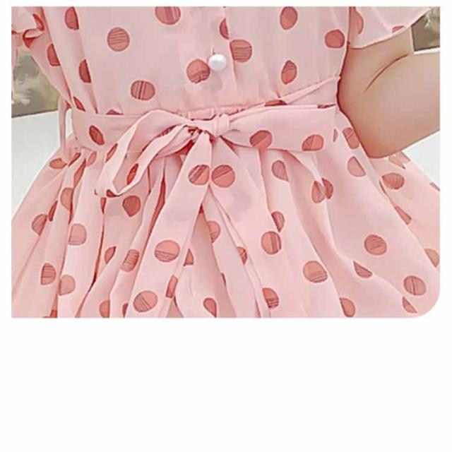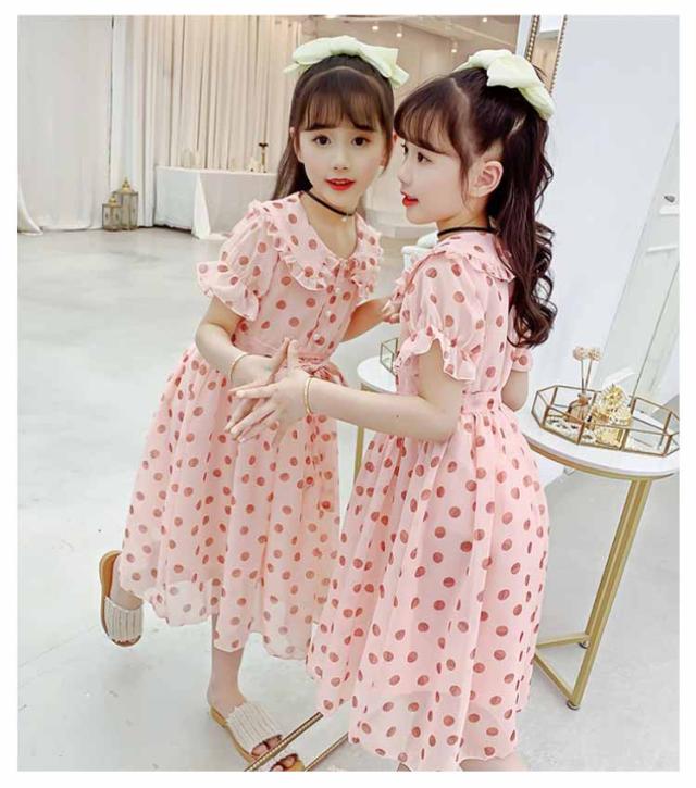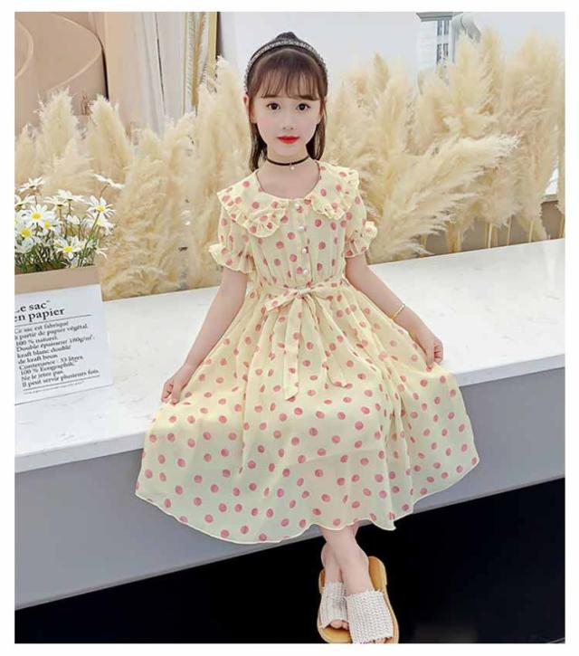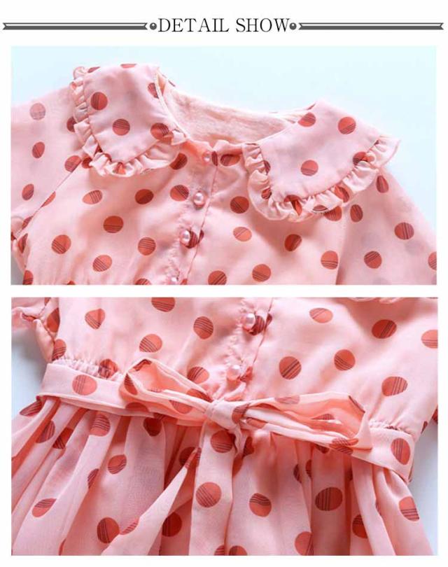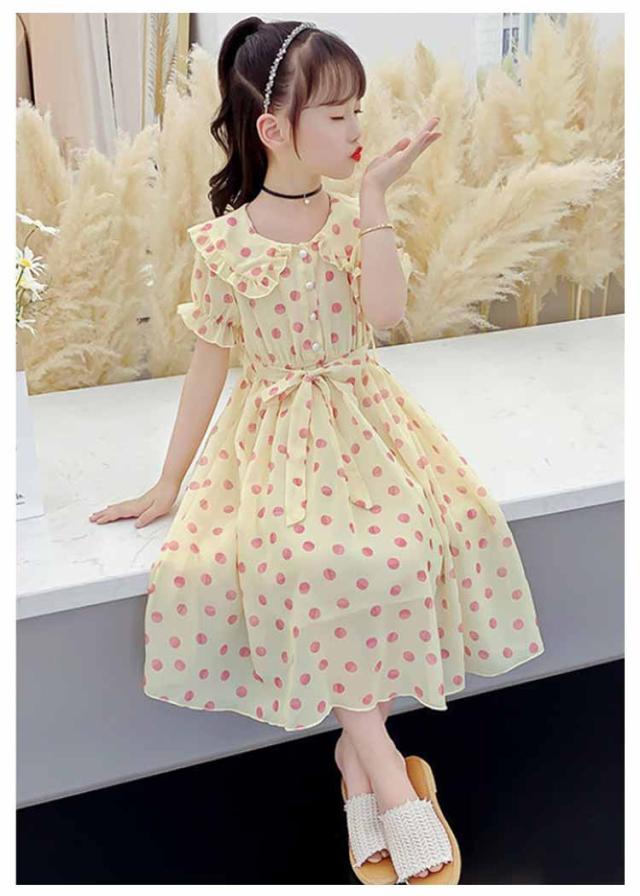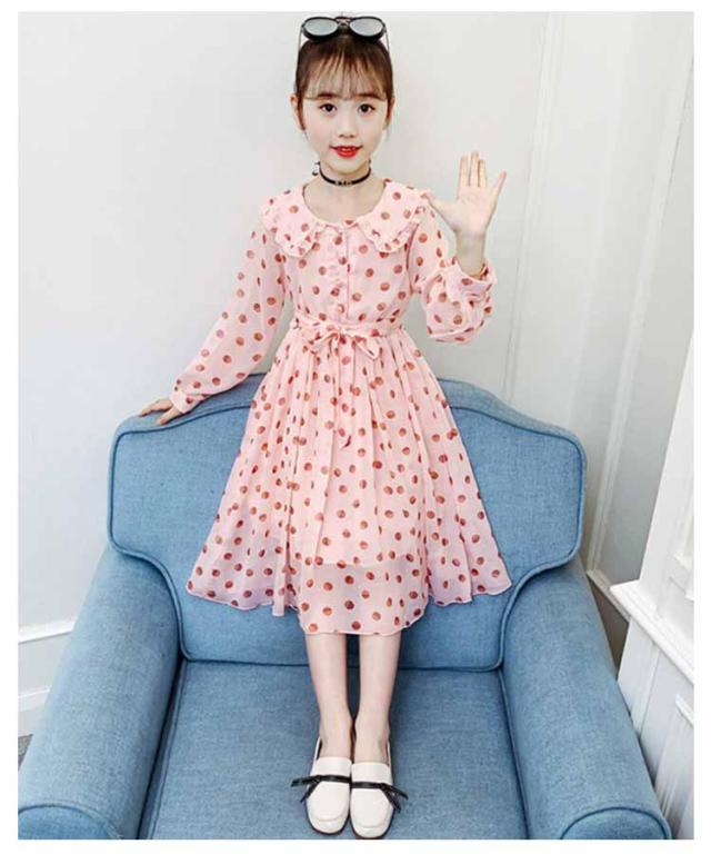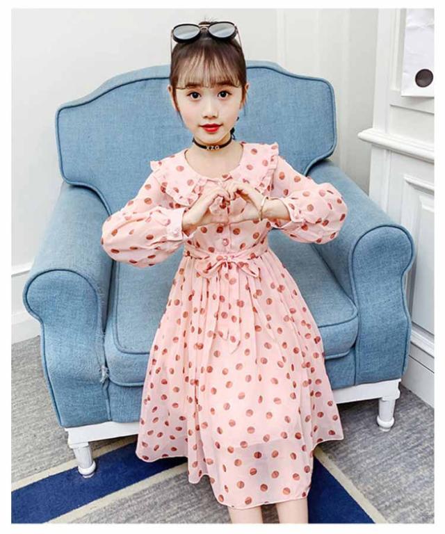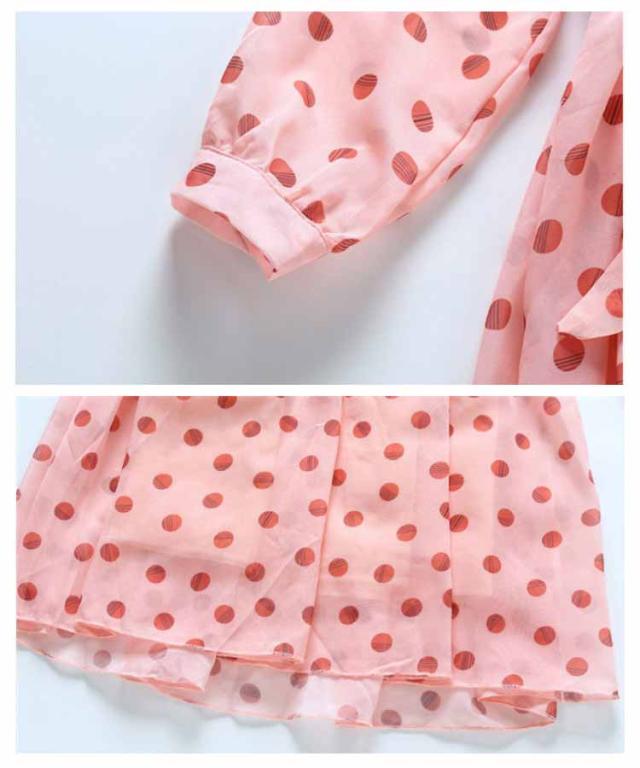 ワンピース 女の子 キッズ 2タイプ シフォンワンピース 春 夏 子供服 半袖 長袖 マキシ丈 ロング丈 ハイウェスト 丸襟付き リボン ドット柄 フレアワンピース 無地 ジュニア 普段着 カジュアル 送料無料 110 120 130 140 150 160