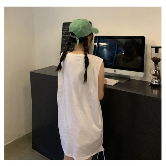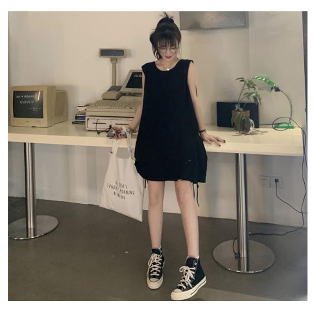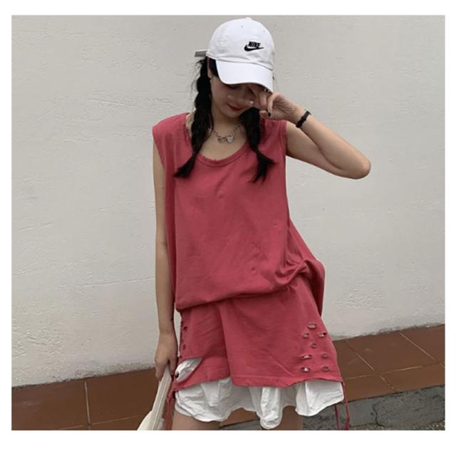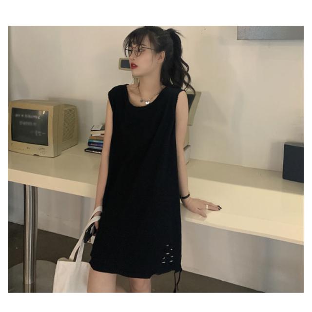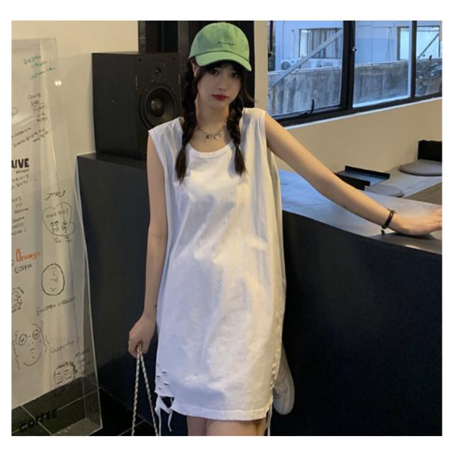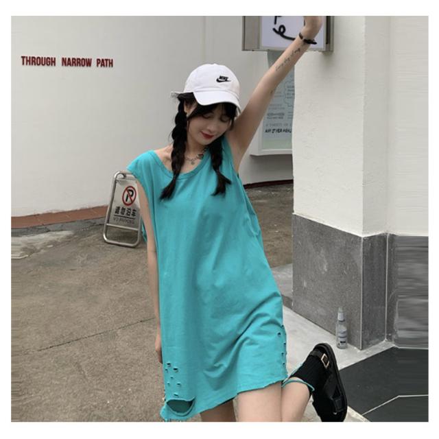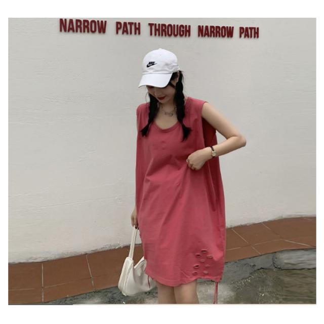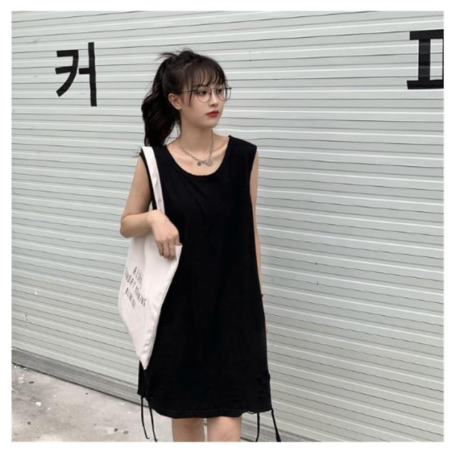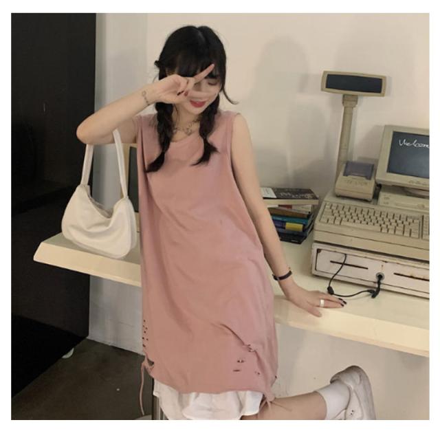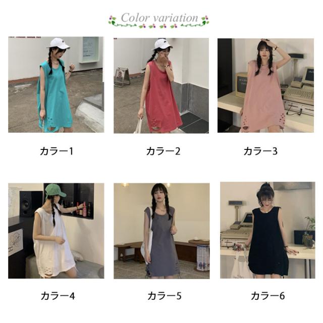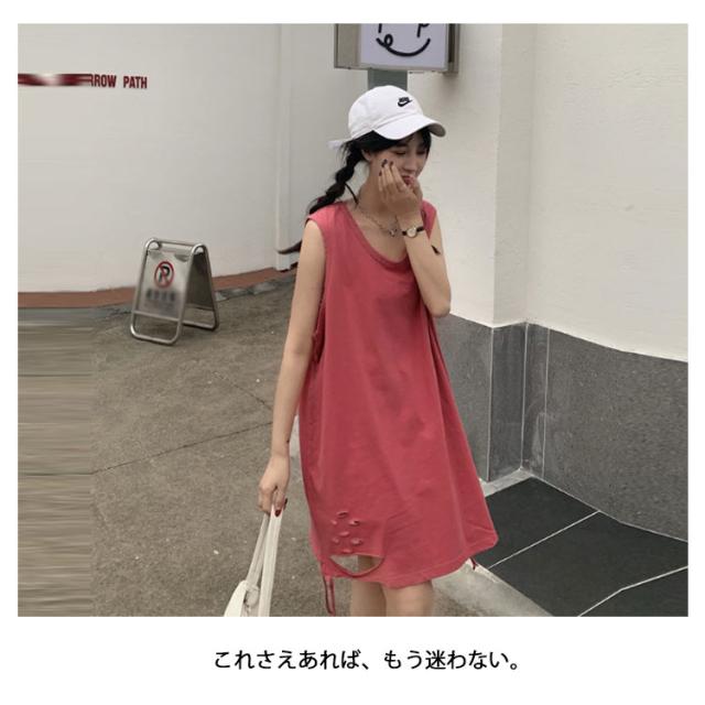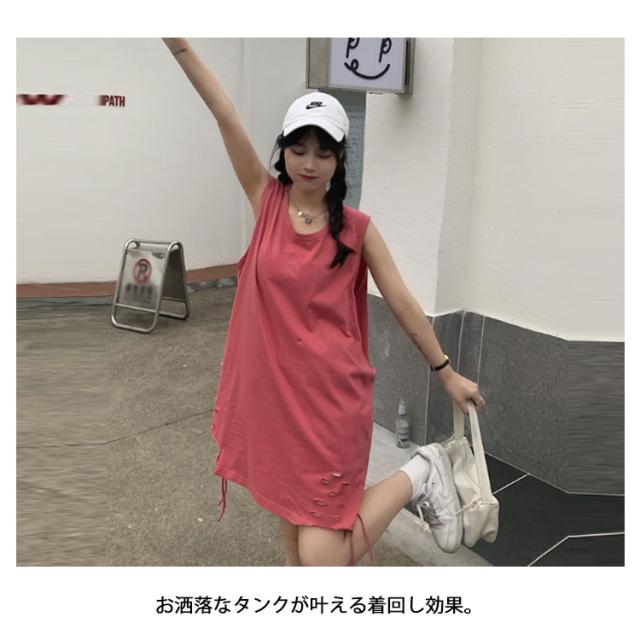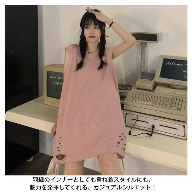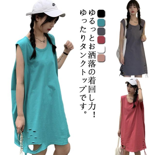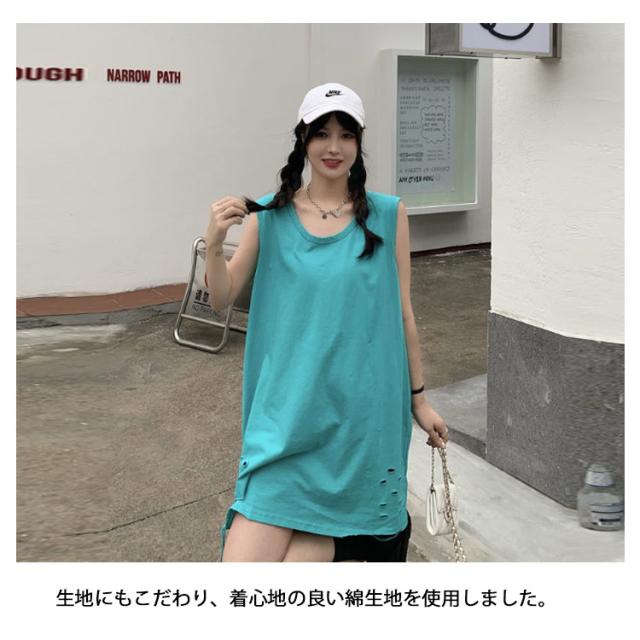 全6色 裾ダメージ タンクトップ レディース レイヤード トップス キャミソール インナー ノースリーブ ラウンドネック ロング丈 ゆったり ダメージ加工 重ね着 お洒落 カジュアル ストリート 綿 M L XL 2XL 送料無料