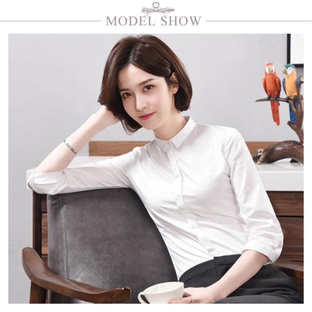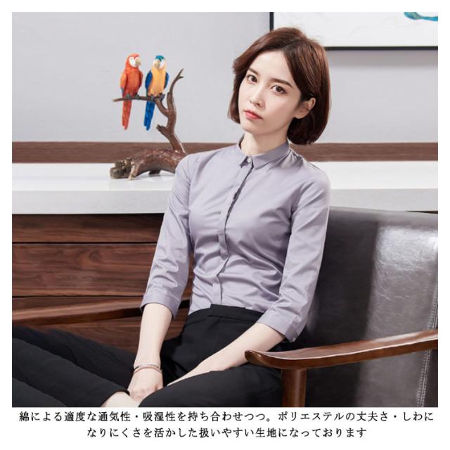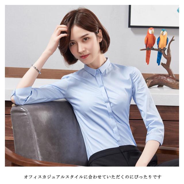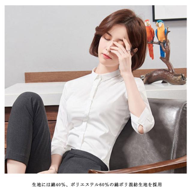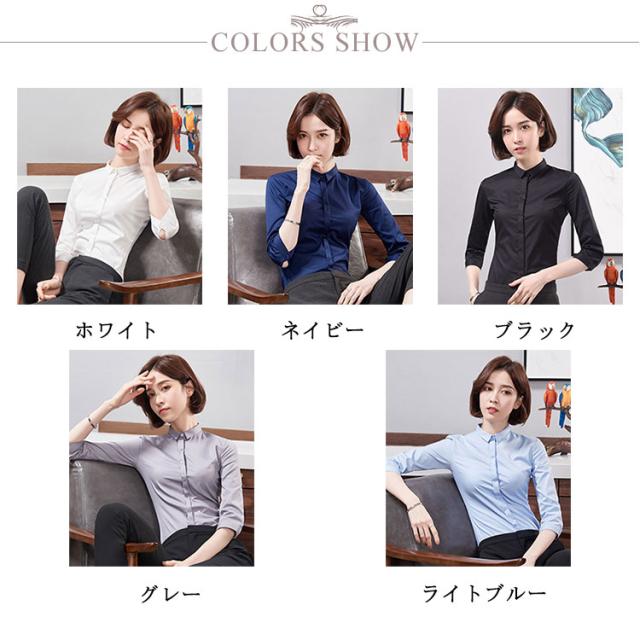 ブラウス ワイシャツ レディース 7分袖 レギュラーカラー オフィス スリム 綿 コットン 白/ホワイト/ブルー/青/ネイビー/グレー/灰/黒/ブラック 送料無料