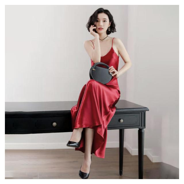 | 韓国デザインのサテンロング丈ワンピース。 Vネックに華奢な肩紐のキャミソールワンピース。 光沢感のある上品なサテン素材でひらひらとエレガント。 春にはレースインナーとコーデして、様々なコーディネートに使えるアイテムです。 | |