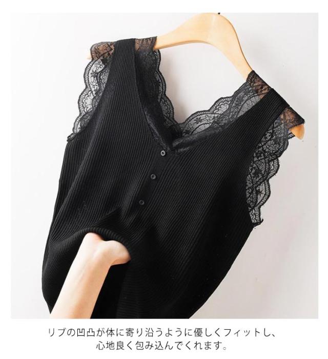リブ編み レース タンクトップ メロウ リブインナー トップス レディース vネック 重ね着 レイヤード ノースリーブ 見せる下着 キャミソール 着?せ ストレッチ レースキャミ フェミニン 見せインナー S-3XL 送料無料