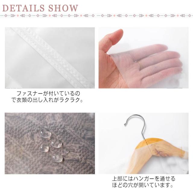 | 衣類を湿気やホコリから守り大切に保管できる洋服カバー。 カバーが透明なので、中の洋服が一目でわかりとても便利。 ファスナーが付いているので衣類の出し入れがラクラク。 通気性が良くホコリを通しにくいメッシュ生地のため、衣類の収納に適しています。 上部にはハンガーを通せるほどの穴が開いています。 | |