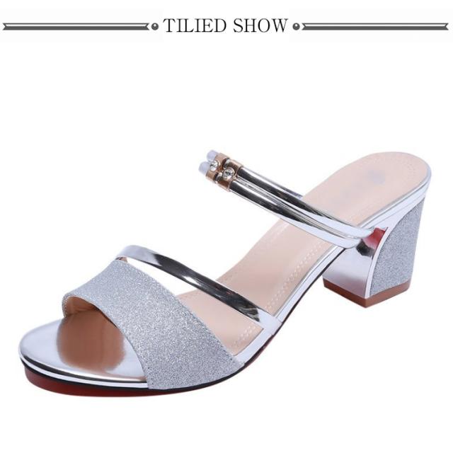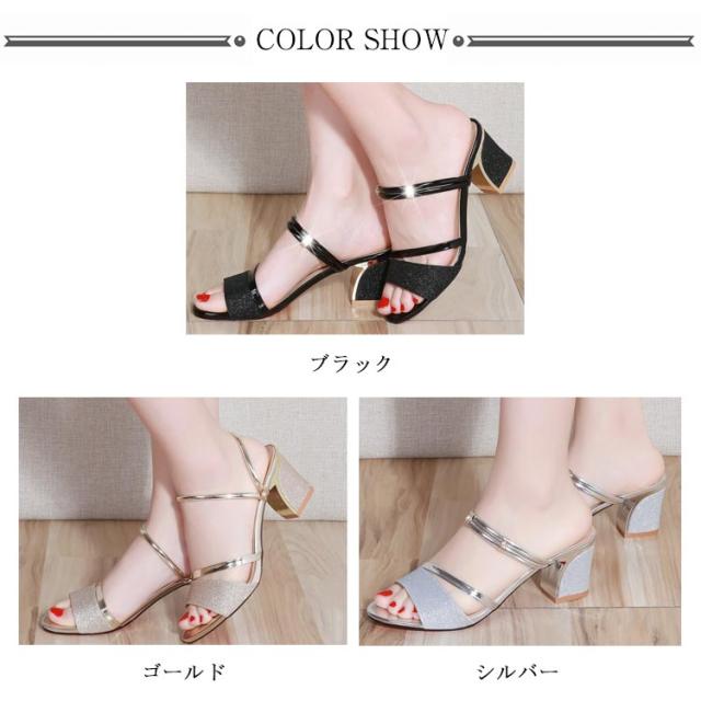 サンダル ハイヒール レディース ミュールサンダル ミュール 太ヒール 夏 6cmヒール チャンキーヒール 美脚 オープントゥ サンダル スリッパ シューズ 疲れない 歩きやすい トレンド キラキラ パーティ 通勤 オフィス 婦人靴