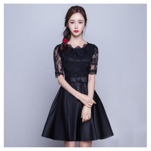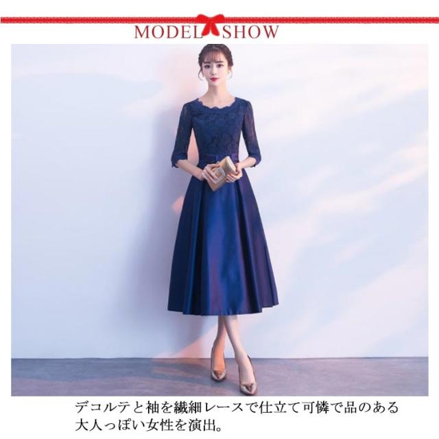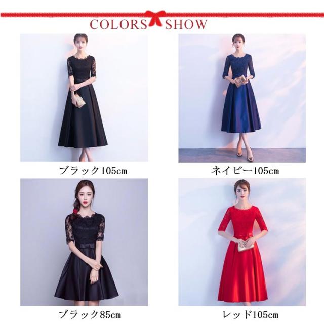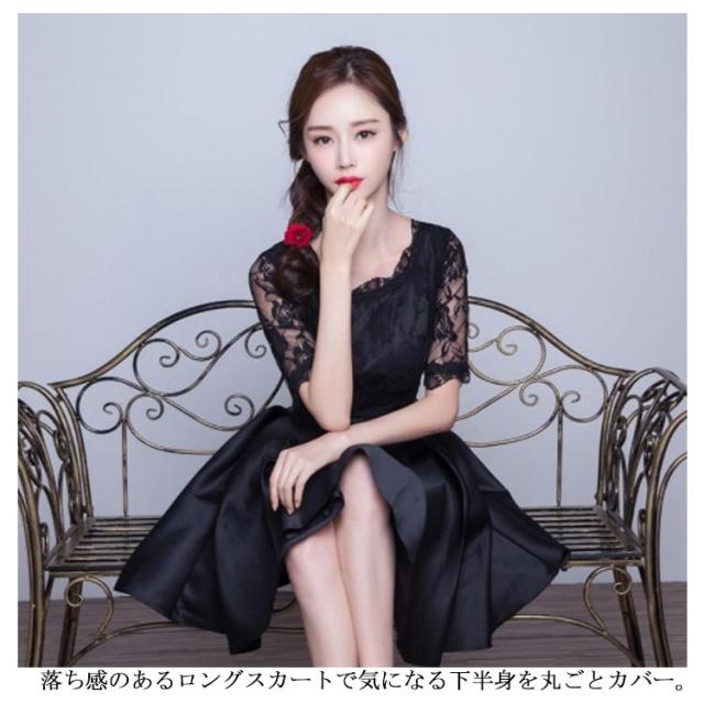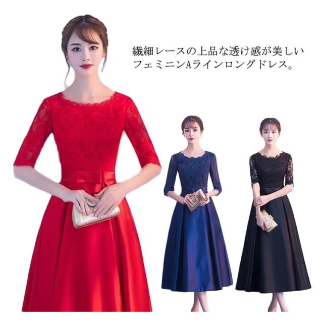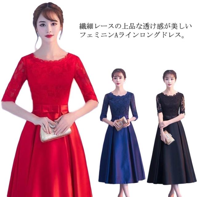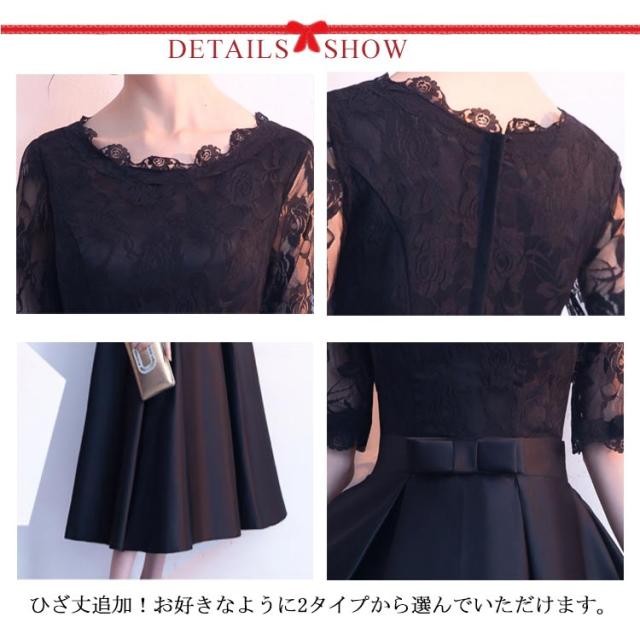 パーティードレス ロングドレス レース シースルー袖 夏新作 半袖 Aライン ウェストマーク 黒ドレス ワンピース エレガント 結婚式 二次会 袖あり ウェディングドレス お呼ばれ 卒業会 演奏会 発表会 ひざ丈追加