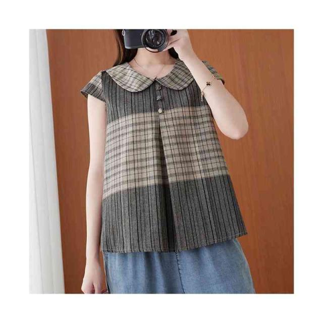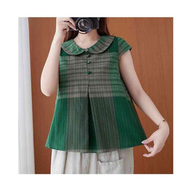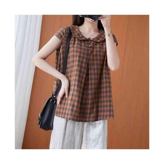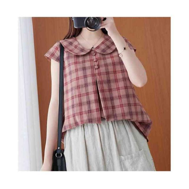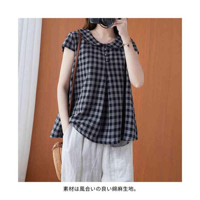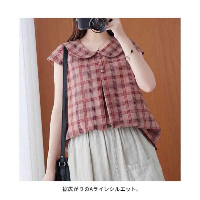 チェック柄 折り襟 ブラウス レディース セーラーカラー 夏 半袖 ボタン リネンブラウス 無地 綿麻 前後差 シンプル Tシャツ 通勤 OL リネン混 オフィス ジュアル 体型カバー きれいめ ゆったり おしゃれ 6色 人可愛い 春 夏