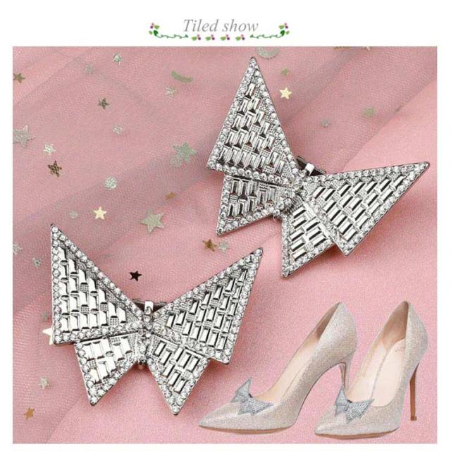 | 取り外し可能、パッとパンプスが華やかに、ラインストーンダイヤレーンで模ったスクエア型と蝶型のビジューシューズクリップです。 存在感があり、スタイリッシュなデザインです。 足元を輝かせ、お洒落上級者の花嫁様にお勧めです。 パンプスやハイヒールはもちろん、手袋や帽子、バッグなどにワンポイントとして付けたり、ヘアゴムに付ければヘアアクセサリーとしても楽しめます。 パーティだけでなく女子会やデート、飲み会にもおすすめです。 | |