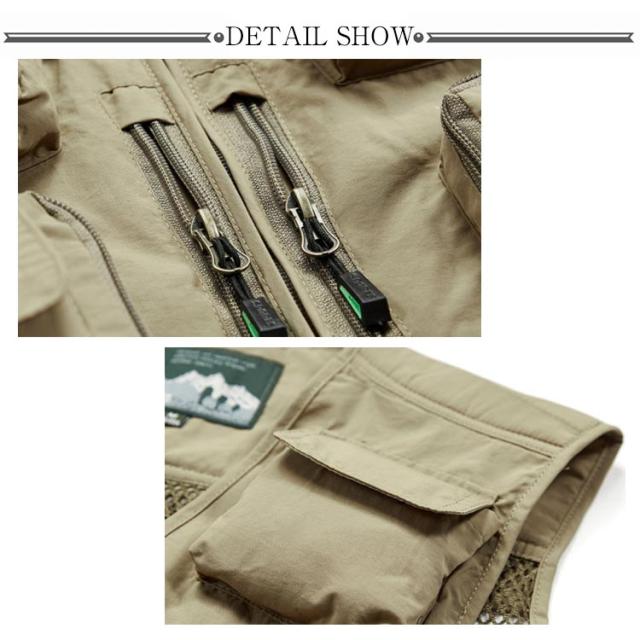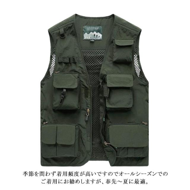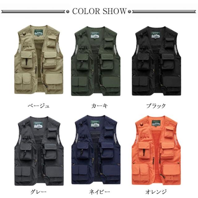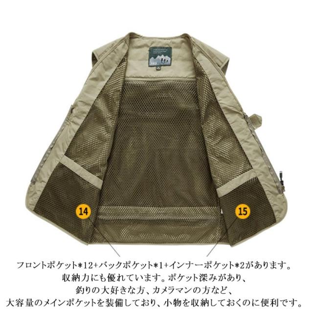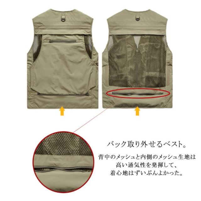 | 撮影、釣り、キャンプは勿論、旅行や休日も気軽に着用できるアウトドアベストです。 背中のメッシュと内側のメッシュ生地は高い通気性を発揮して、着心地はずいぶんよかった。 バック取り外せるベスト。 フロントポケット*12+バックポケット*1+インナーポケット*2があります。収納力にも優れています。ポケット深みがあり、釣りの大好きな方、カメラマンの方など、大容量のメインポケットを装備しており、小物を収納しておくのに便利です。 季節を問わず着用頻度が高いですのでオールシーズンでのご着用にお勧めしますが、春先〜夏に最適。 ウオーキング、登山、撮影、釣り、フィッシング、作業、キャンプ、遠足、旅行などの幅広いなどのシーンで利用することができます。 | |