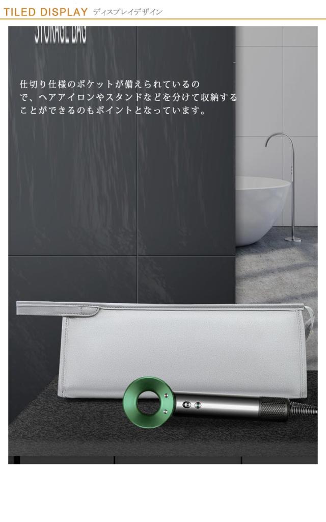 | 持ち運びや旅行に最適!ダイソンドライヤー専用収納ポーチ 仕切り仕様のポケットが備えられているので、ヘアアイロンやスタンドなどを分けて収納することができるのもポイントとなっています。 上質・撥水機能があるPU素材を使用して水や埃から大切なドライヤーを守ります。 汚れ部分は拭き取るだけでお手入れも簡単です。 持ち手を付属しているため、吊り収納また出張、旅行の持ち運びも楽ちん♪ | |