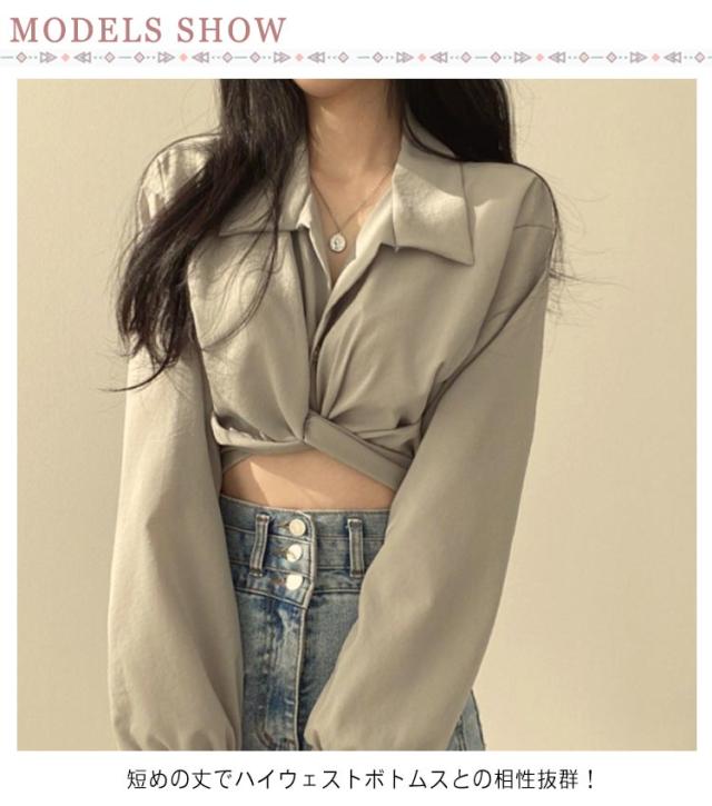 リボン ブラウス 長袖 バック へそ出し ゆったり レディース ツイスト シャツ 絞りデザイン 韓国 セクシー ダンス衣装 ショート丈 ファッション おしゃれ 可愛い 無地 シンプル トップス カジュアル シック シャツ