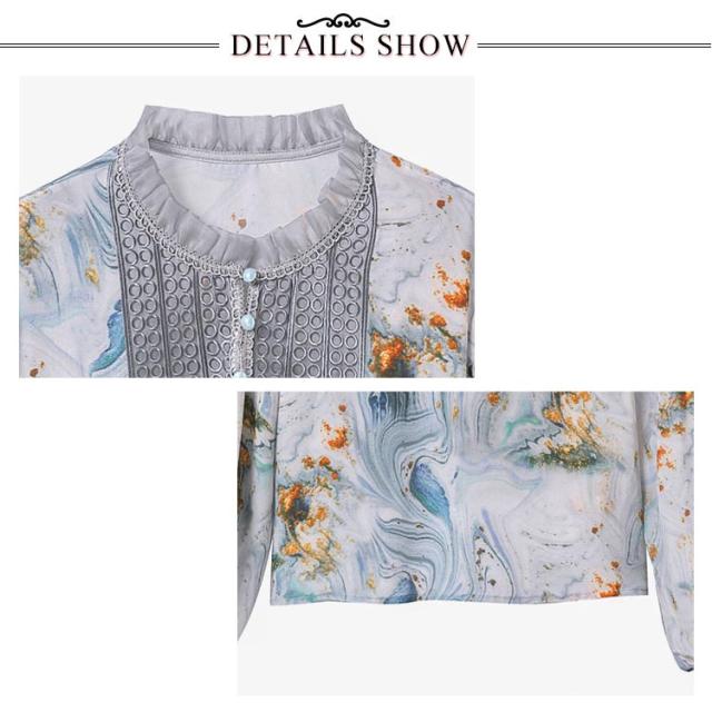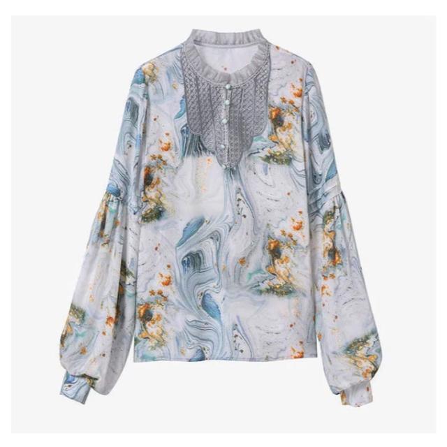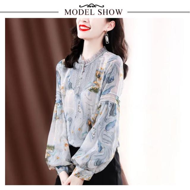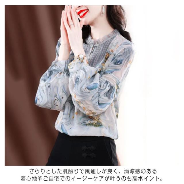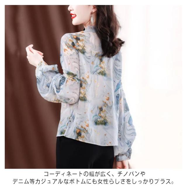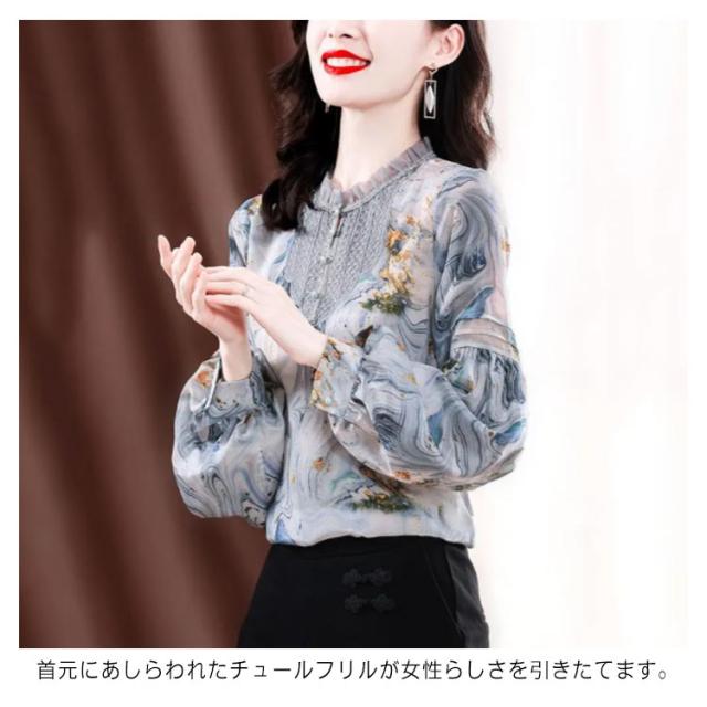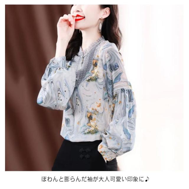 ブラウス レディース シフォン生地 ブラウス 春夏 長袖 トップス カットソー 水彩画 プリント 総柄 チュールフリル ボリューム袖 大きいサイズ ゆったり おしゃれ きれいめ カジュアル オフィス 通勤 女子会 送料無料