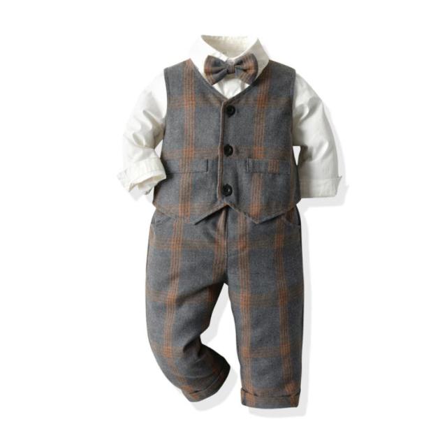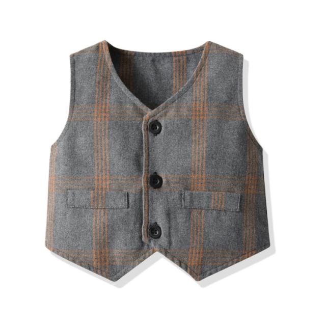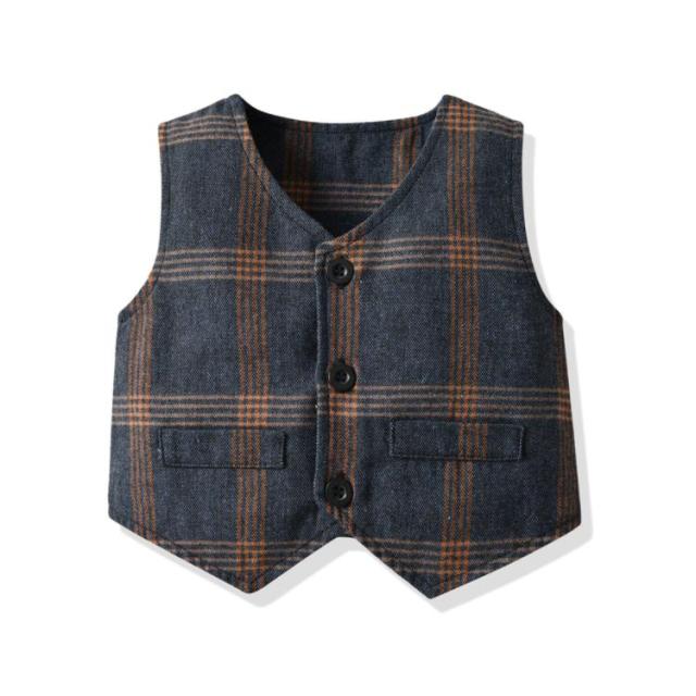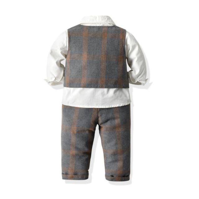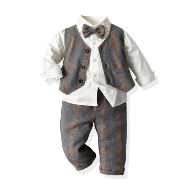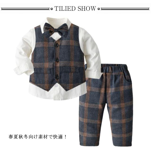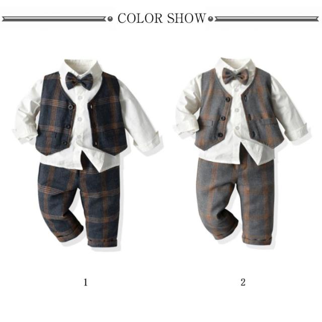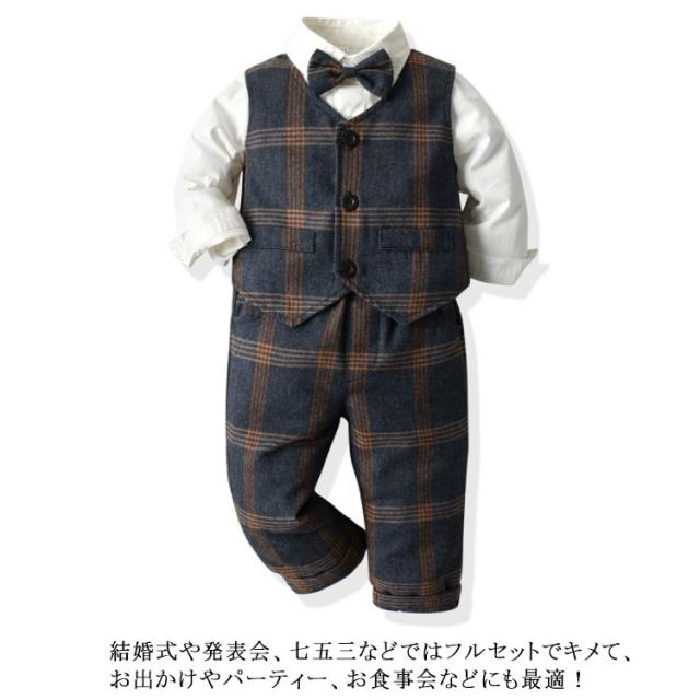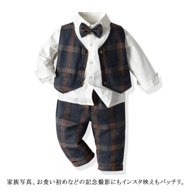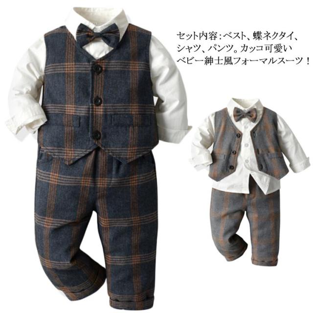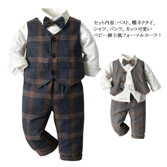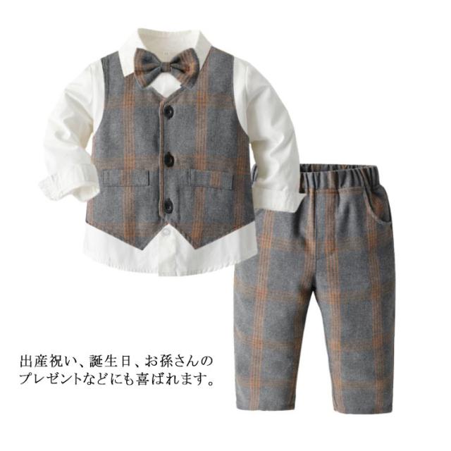 子供服 キッズ フォーマル スーツ ブレザー 男の子 ベビー服 3点セット 蝶ネクタイ付き シャツ/ベスト/パンツ 卒園式 入園式 七五三 お宮参り スーツ チェック柄 タキシード風 結婚式 ベビー スーツ 70 80 90 100 110 120 130
