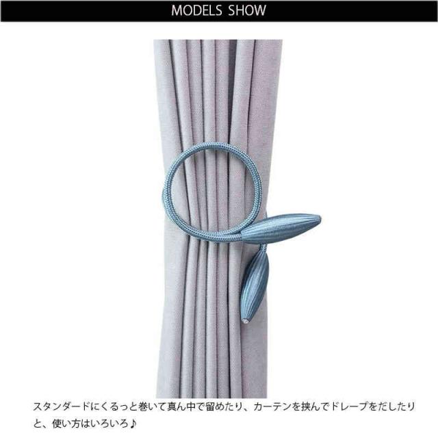 | カーテンに巻いて留めるだけで、簡単にイメージチェンジできるシンプルで使いやすいタッセルです。 くるっと巻いてパチンとするだけ。 賃貸やアパート、マンションなど、壁を傷つけられない人にもおすすめ。 さらに、マグネットの留め方でいろいろな雰囲気が楽しめる優秀なカーテンタッセルです。 スタンダードにくるっと巻いて真ん中で留めたり、カーテンを挟んでドレープをだしたりと、使い方はいろいろ♪ | |
