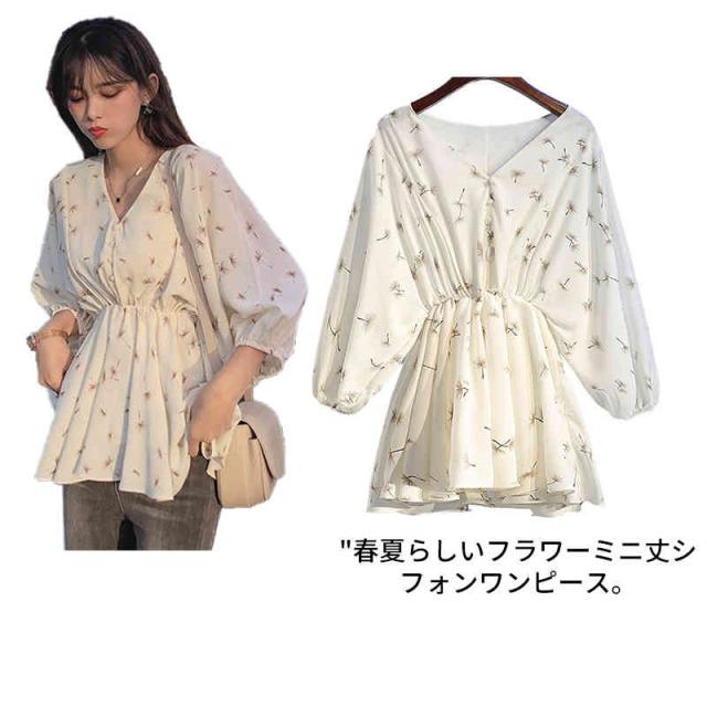 トップス レディース シフォン ミニワンピース Vネック 花柄 チュニック ゆったり Tシャツ カジュアル 春コーデ 夏コーデ 上品 きれいめ 通勤 大きいサイズ 春夏 フォーマル おしゃれ 可愛い