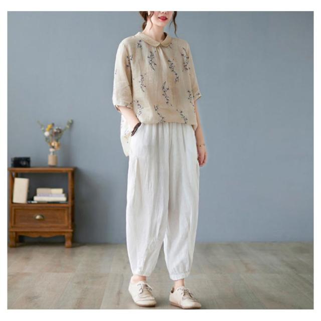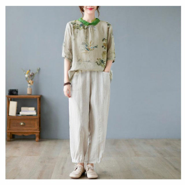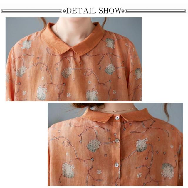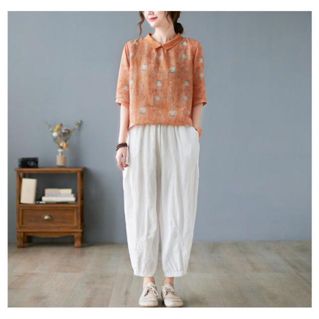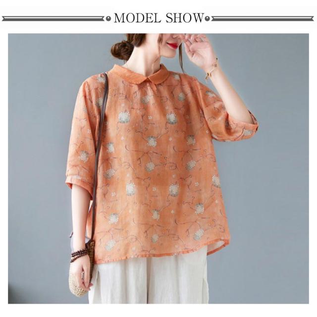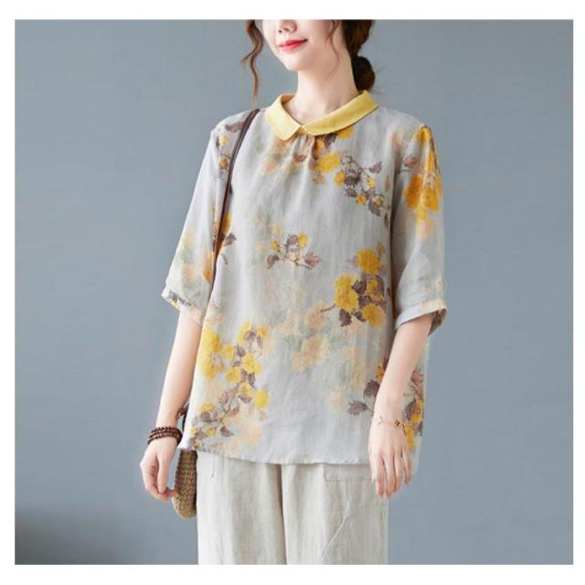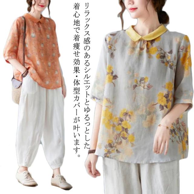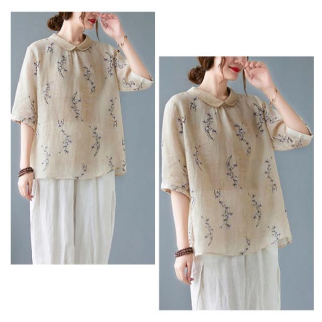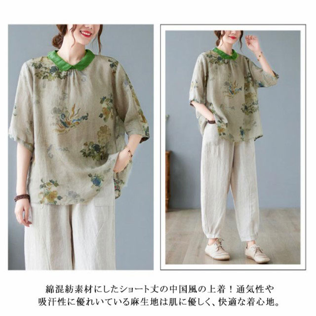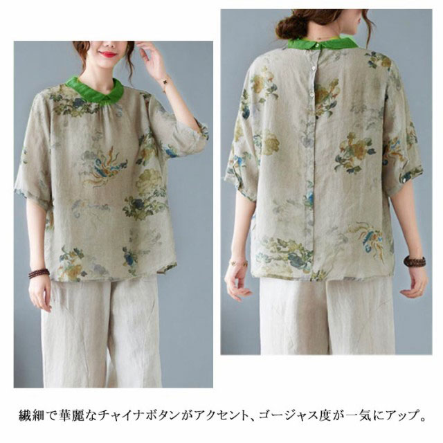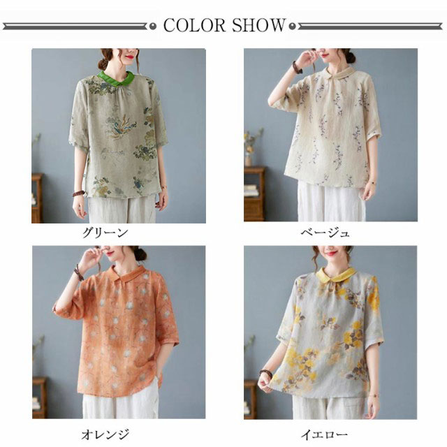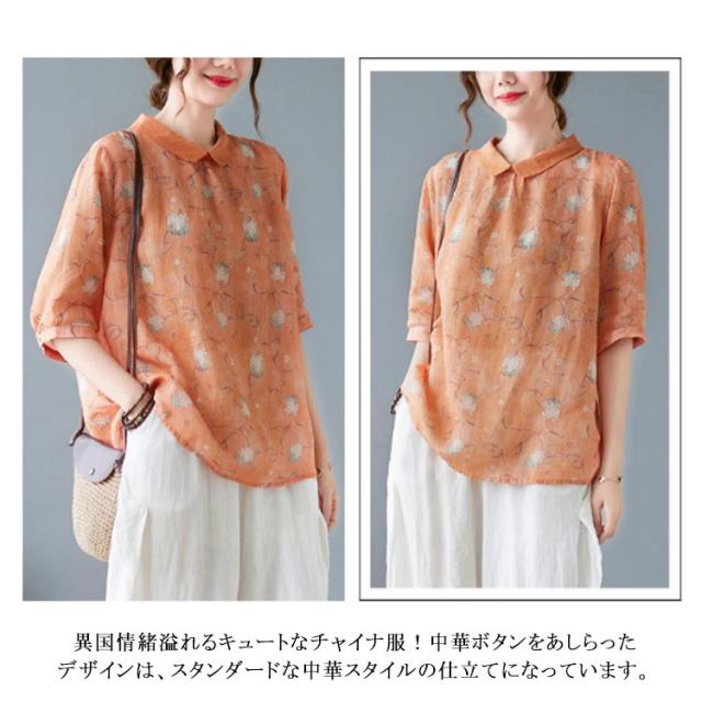 チャイナ風 シャツブラウス レディース 中国風 リネンシャツ 半袖 五分袖 プリント チャイナ風 プルオーバー 薄手 ゆったり 折り襟 カジュアル 総柄 花柄 春 夏 夏物 涼しい 送料無料