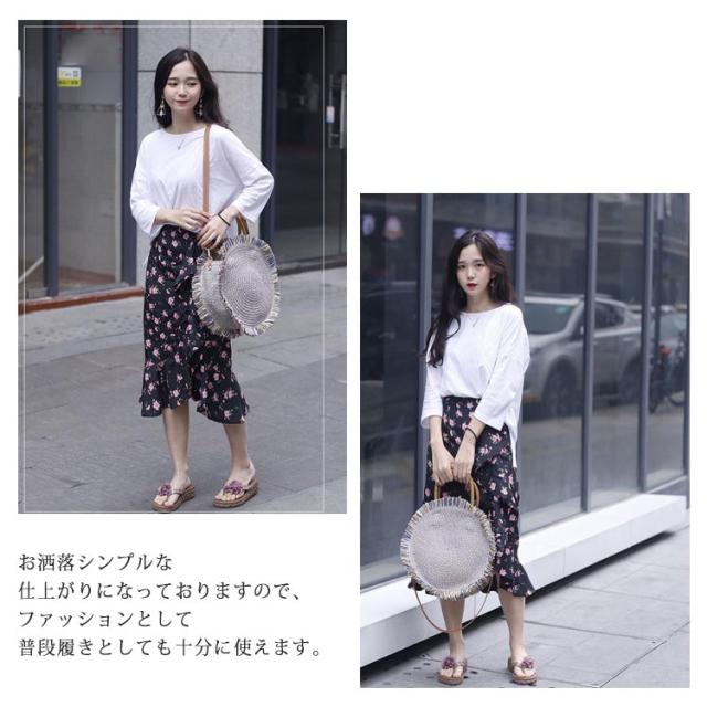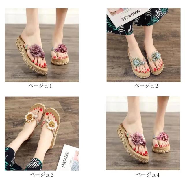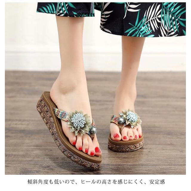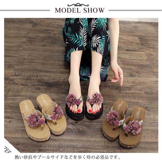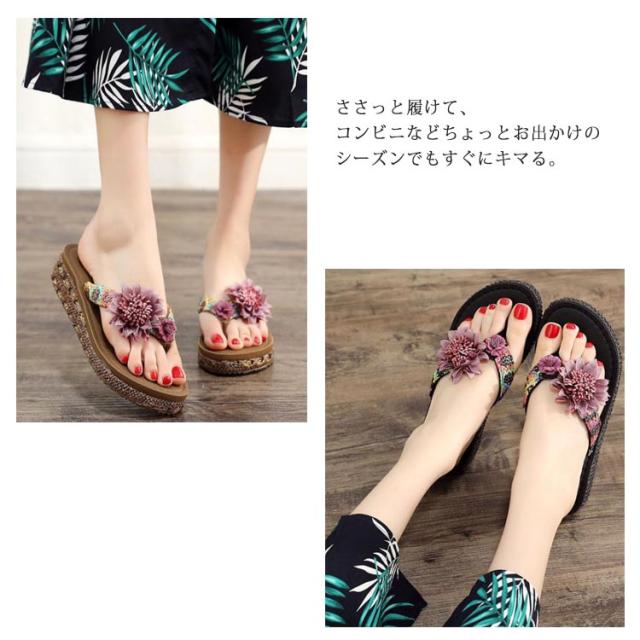 | 海やプールに出かけた時にオススメ厚底サンダル! 熱い砂浜やプールサイドなどを歩く時の必需品です。 お洒落シンプルな仕上がりになっておりますので、ファッションとして普段履きとしても十分に使えます。 お花モチーフがかわいいポイント。 傾斜角度も低いので、ヒールの高さを感じにくく、安定感 滑り止め付き。 裏面は滑り止め仕様になっているので滑りにくく、プールでも安心。 指の間にあたる部分は柔らかい生地になっており、痛くなりにくく長時間の着用時も安心。 ささっと履けて、コンビニなどちょっとお出かけのシーズンでもすぐにキマる。 | |