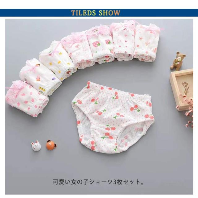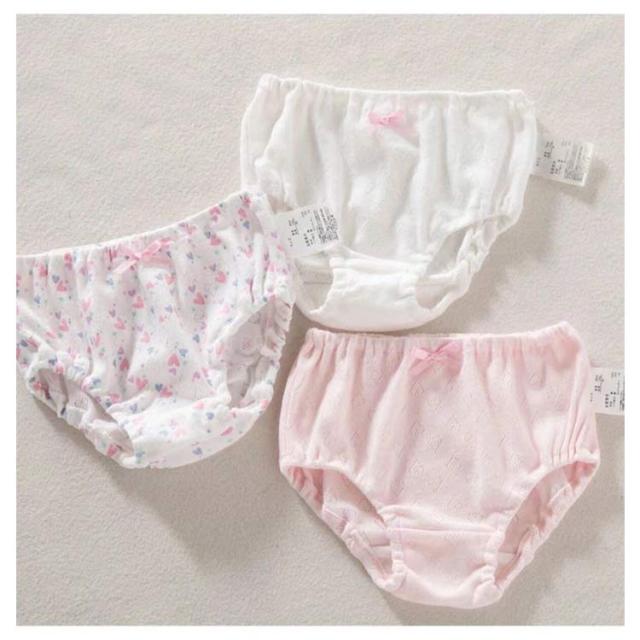 | 可愛い女の子ショーツ3枚セット。 綿で通気性も良くお肌にも優しい。 ウェストには、お腹への圧迫の少ない柔らかなウェストゴムが使用されています。 生地がしっかりしていて、洗濯も安心。 | |