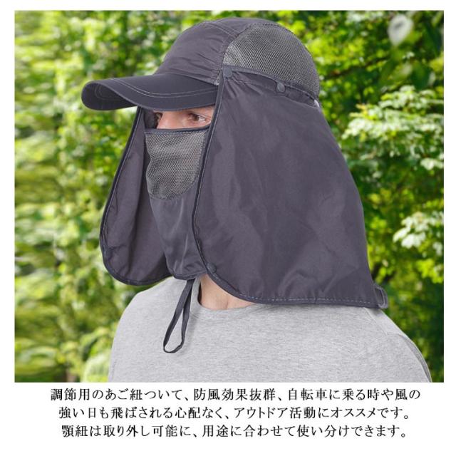| 首までガード、完全防備のUVカット紫外線対策用 マスク付日よけ帽子。 軽量で大きなつば広帽子・サンバイザー、フェイスガード、ネックガードの組み合わせでシーンに合わせ使い方自在なUV対策! 鼻・口の部分はメッシュ素材になっていますので、顔部分のカバーをつけても息苦しくなりません。 調節用のあご紐ついて、防風効果抜群、自転車に乗る時や風の強い日も飛ばされる心配なく、アウトドア活動にオススメです。顎紐は取り外し可能に、用途に合わせて使い分けできます。 軽量・折り畳み可能で、バッグの中に持ち運び可能です。 登山、ハイキング、ウォーキング、日常レジャー、アウトドアスポーツ、夏場の暑い日差しの中での長時間の屋外作業などのシーンで、日除け・紫外線対策に大活躍間違いなし! | |