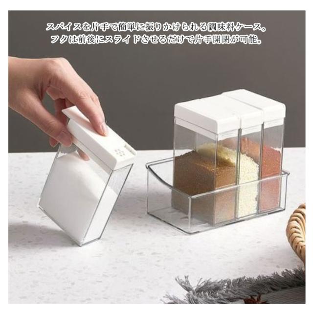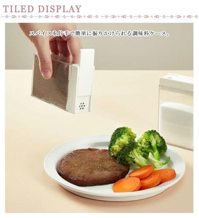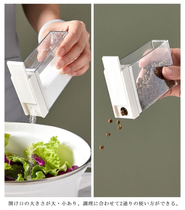 | スパイスを片手で簡単に振りかけられる調味料ケース。 フタは前後にスライドさせるだけで片手開閉が可能。 開け口の大きさが大・小あり、調理に合わせて2通りの使い方ができる。 収まりやすい四角い形状で、スペースに無駄なく収納が出来ます。 クリアなボトルで中身も見えやすいです。 少しずつ振りかけられるので、揚げ物の衣を付けるのにも便利です。 | |