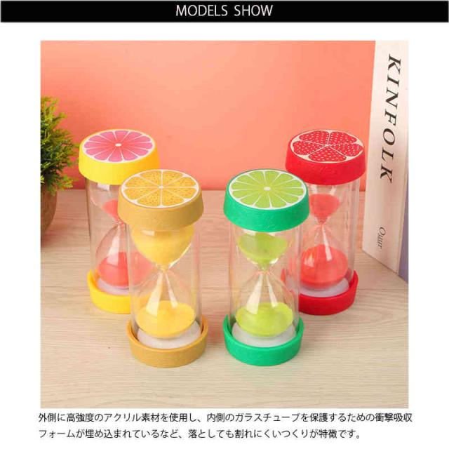 | カラフルな8種類の果物デザインがとてもキュートな砂時計。 外側に高強度のアクリル素材を使用し、内側のガラスチューブを保護するための衝撃吸収フォームが埋め込まれているなど、落としても割れにくいつくりが特徴です。 美味しそうな果物みたいなデザインで、インテリア小物としてさまざまな場所で使用可能。 カラーバリエーションが豊富なので、贈り物としても重宝します。 | |