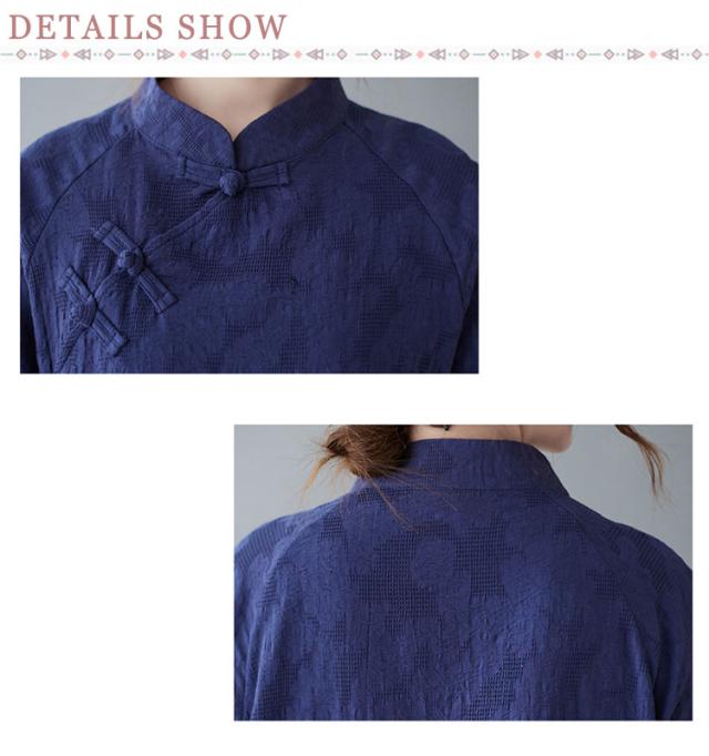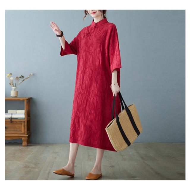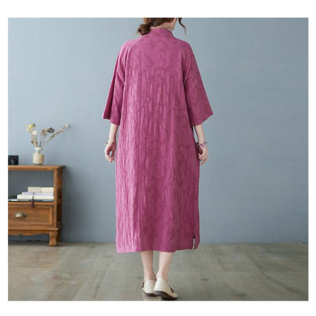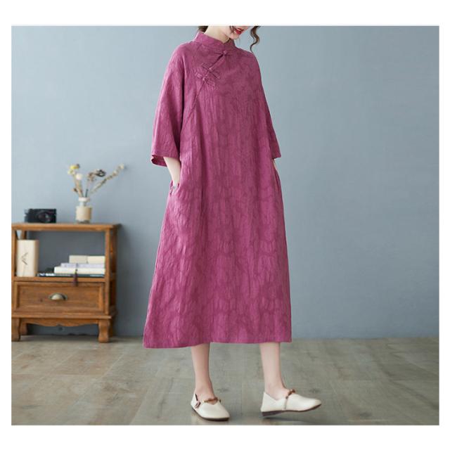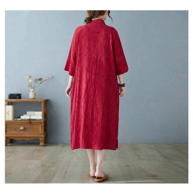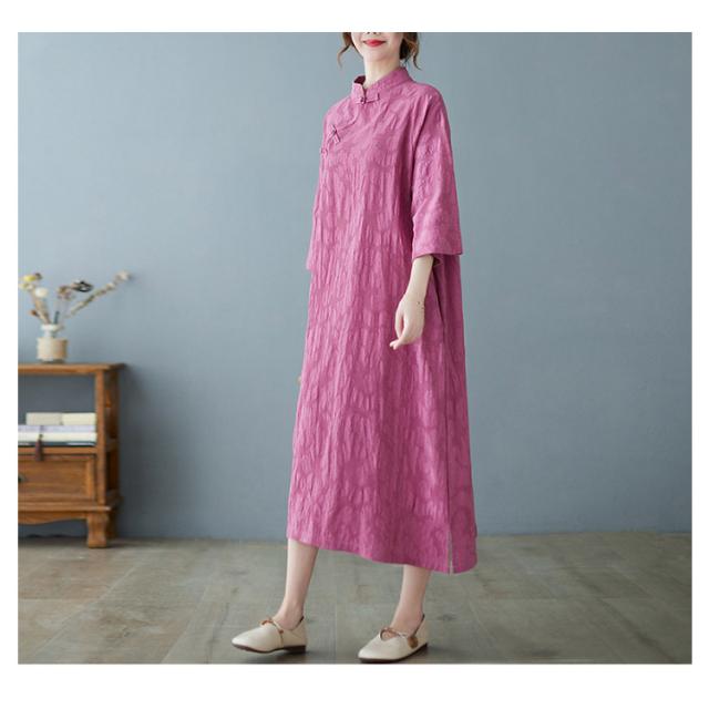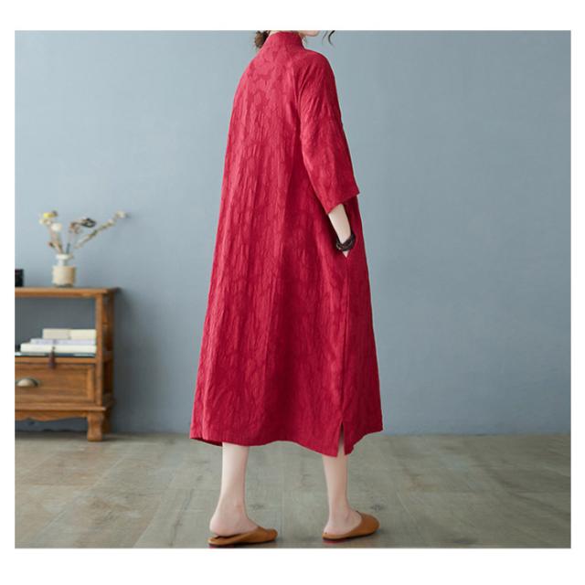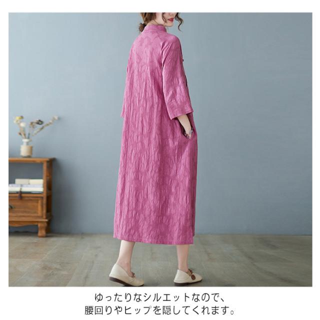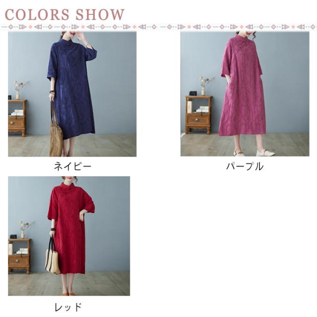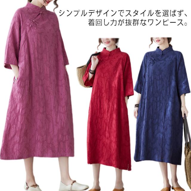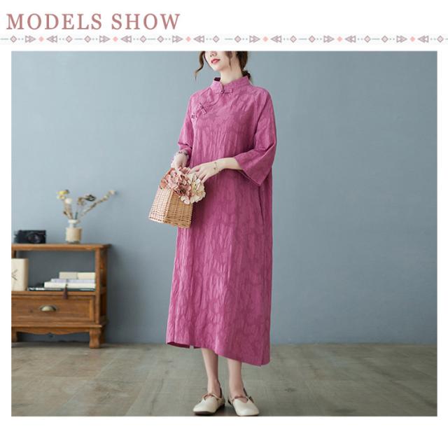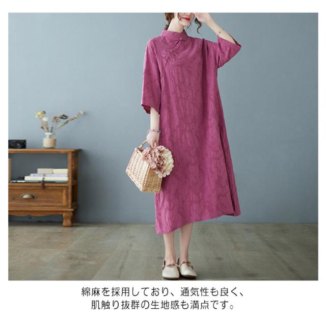 チャイナドレス ワンピース 綿麻 5分袖 立ち襟 ロング丈 民族風 ナチュラル ゆったり 体型カバー お洒落 大きいサイズ 春夏