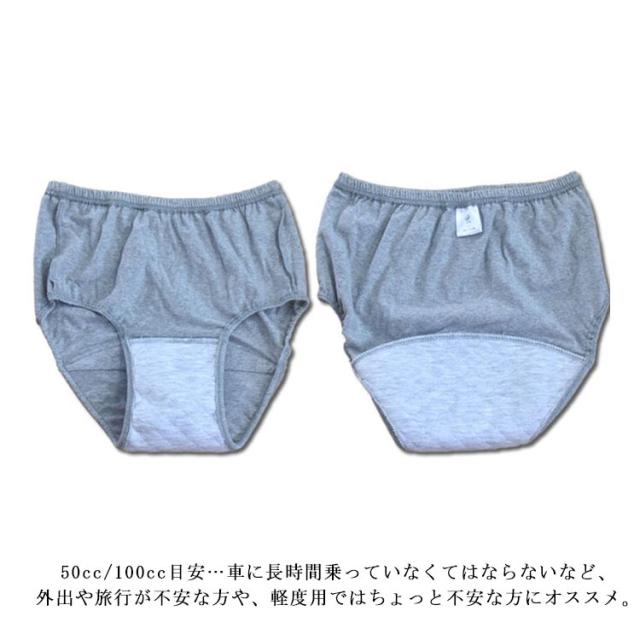 | 軽い尿モレが気になる女性/男性の皆さんへ パッド不要だからごわつかない快適な履き心地です。 50cc/100cc目安…車に長時間乗っていなくてはならないなど、外出や旅行が不安な方や、軽度用ではちょっと不安な方にオススメ。 薄いのにしっかり吸収!お尻まで吸水可能! 見た目や履き心地が普通のショーツと変わらない失禁対応パンツは繰り返し着用することが出来るので、経済的でゴミも削減でき、大変おススメです! | |