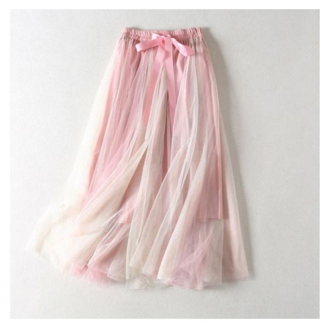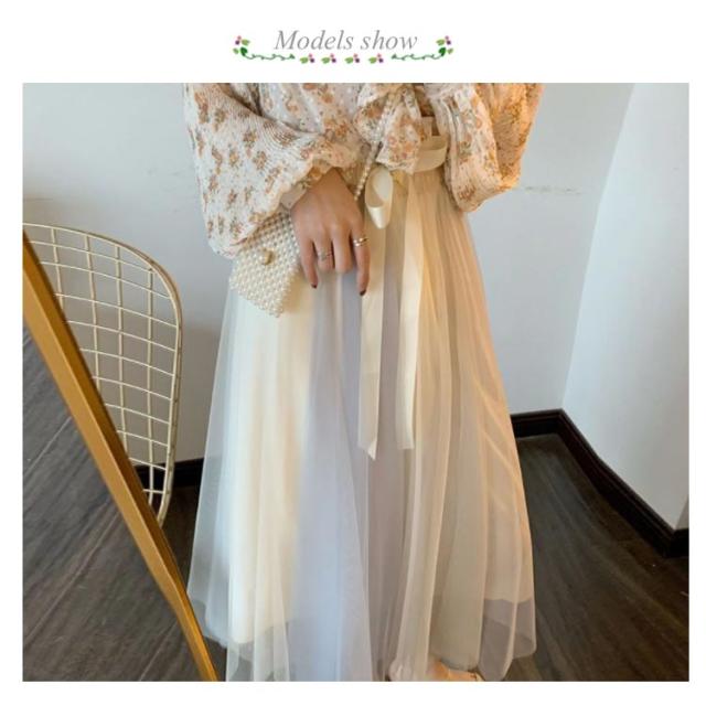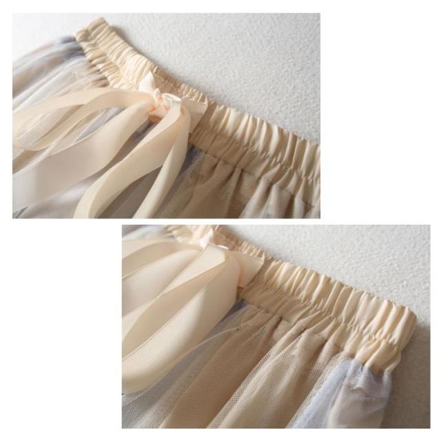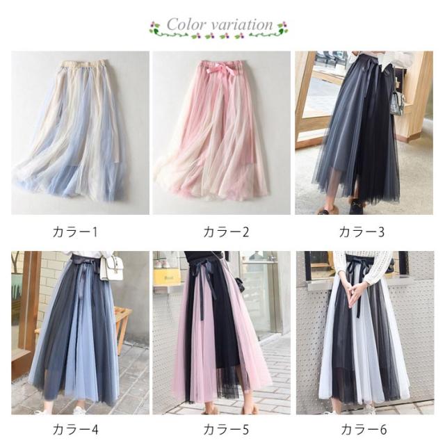バイカラー チュールスカート ロングスカート フレアスカート マキシスカート プリーツスカート ハイウエスト 春 夏 裏地付き きれいめ リボンウェスト 静電気防止 10代 20代 30代 40代 送料無料