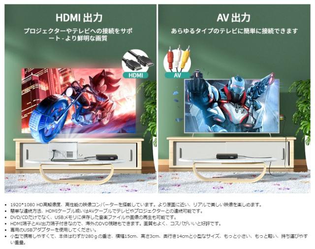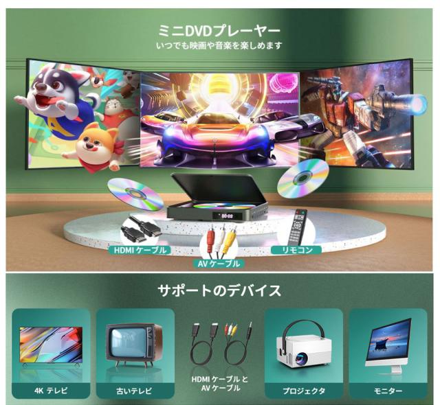 ミニDVDプレーヤー 携帯式DVDプレーヤー リージョンフリー CPRM対応 テレビやプロジェクターなどに接続して再生可能 USB給電