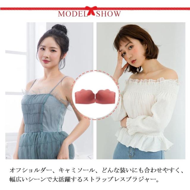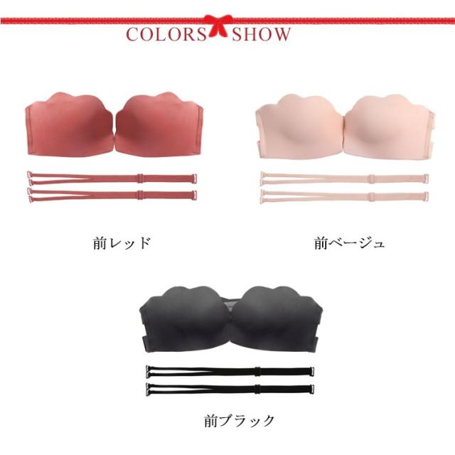 | かわいいスカラップデザイン、ずれにくいのに盛れるストラップレスブラ。 ストラップレスだと谷間に自信が持てない時にはフロントホックで谷間をメイク、ワイヤーレスで優しい着け心地。 シームレスで響きにくく、綺麗なシルエットにカップ部分は柔らか素材で通気性があり汗ばむ季節も快適。 ストラップレスは肩や背中開いた服やドレスの時だけでなく肩紐の食い込みや肩こりのお悩みも解決。 オフショルダー、キャミソール、どんな装いにも合わせやすく、幅広いシーンで大活躍するストラップレスブラジャー。 ストラップ付きなので、普通のブラジャーにも変身可能! | |