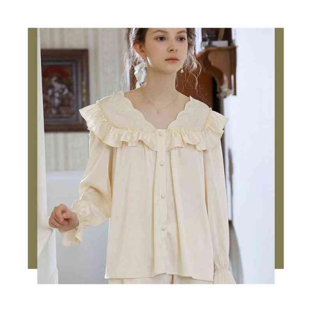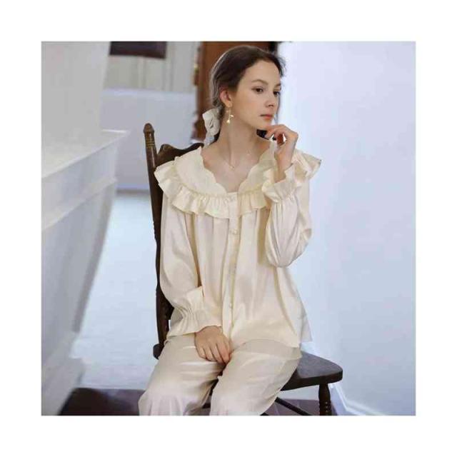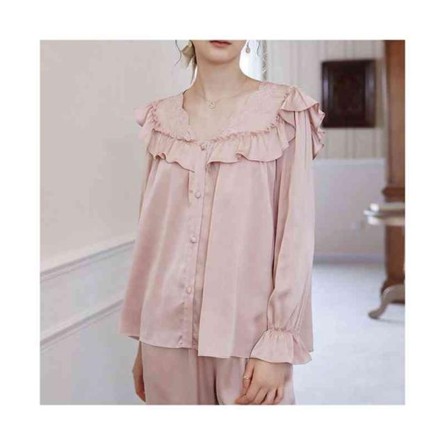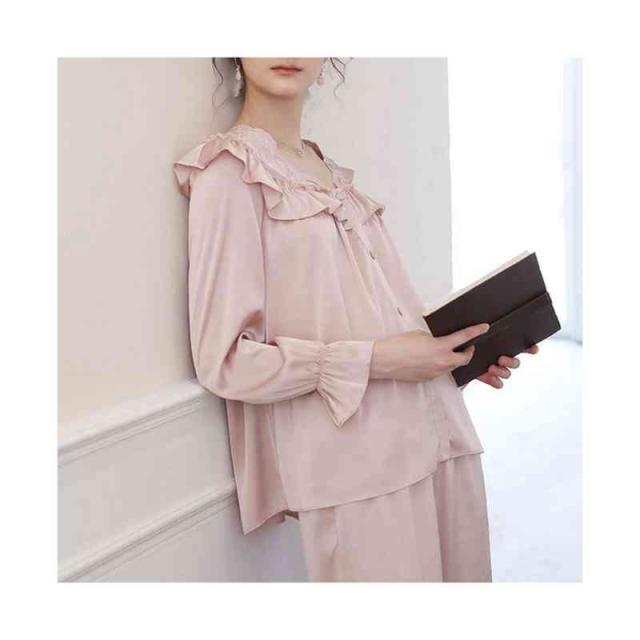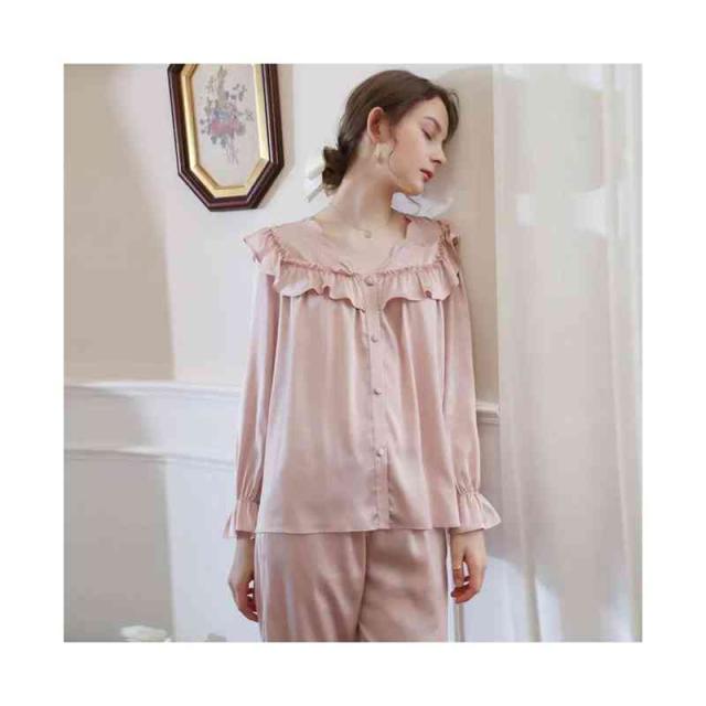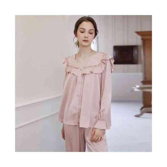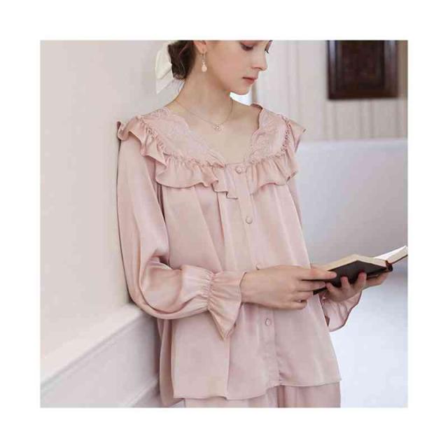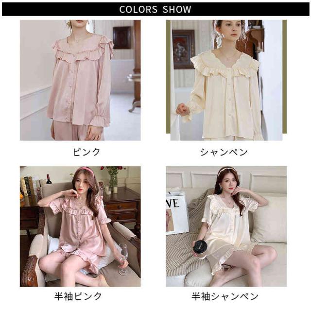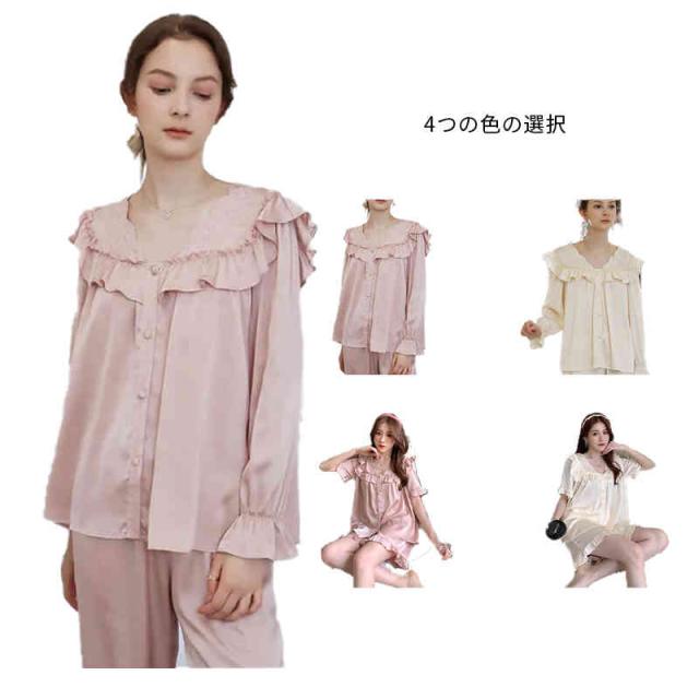 フリルパジャマ レディース 春夏 秋 長袖 半袖 薄手 シンプル Vネック ルームパジャマ フリル 二点セット 上下セット セットアップ 部屋着 姫系 寝巻 ルームウエア 無地 シンプル カジュアル おしゃれ フェミニン 送料無料