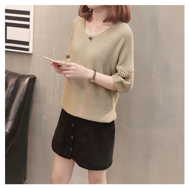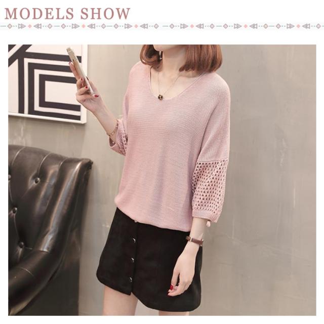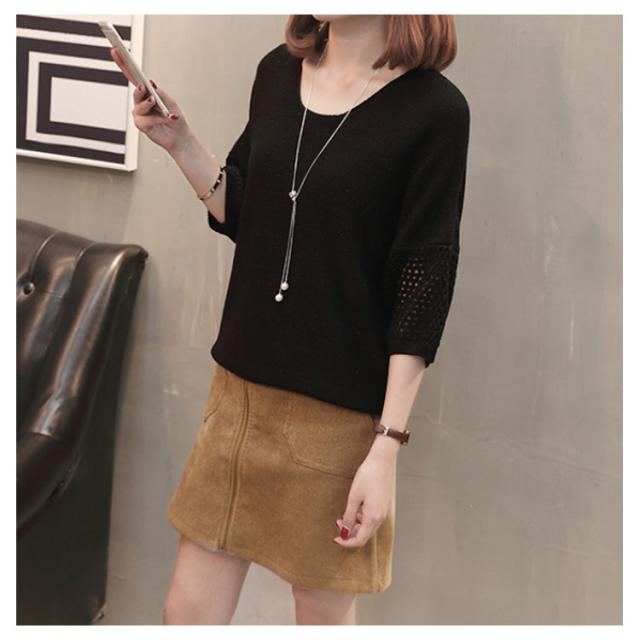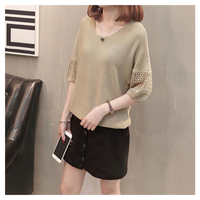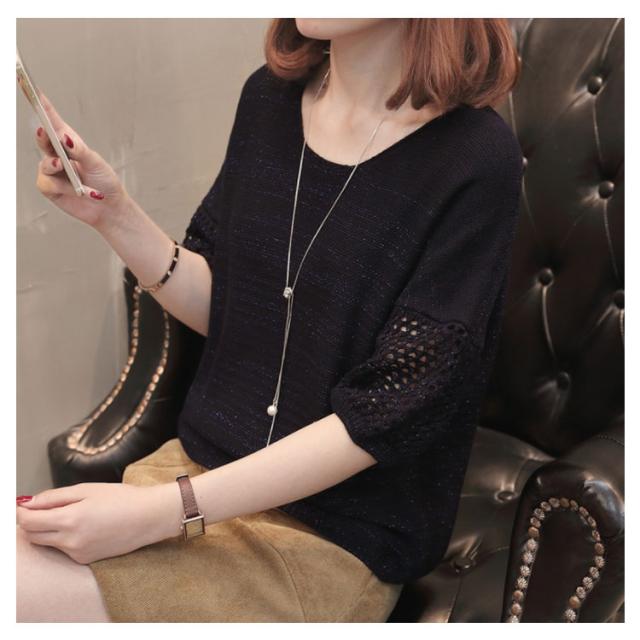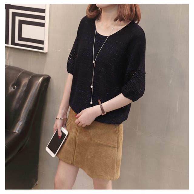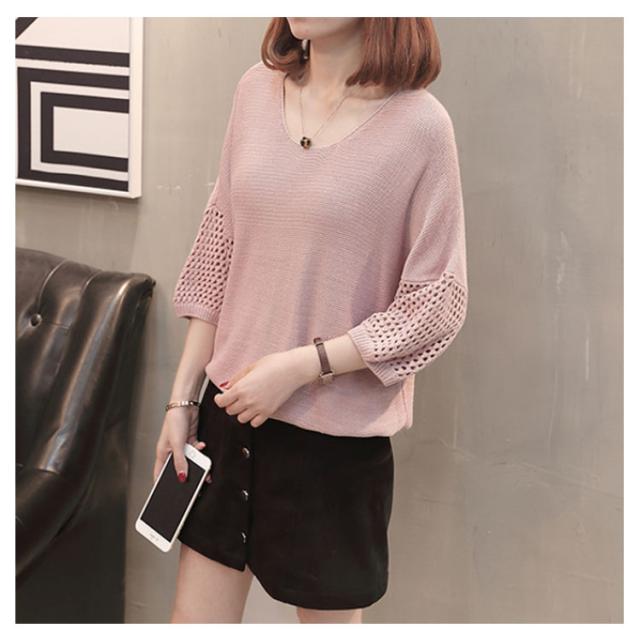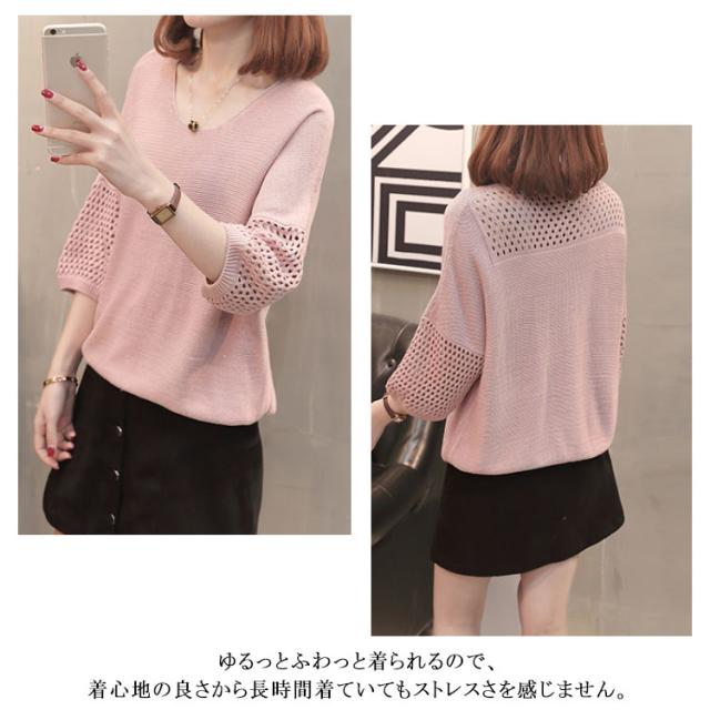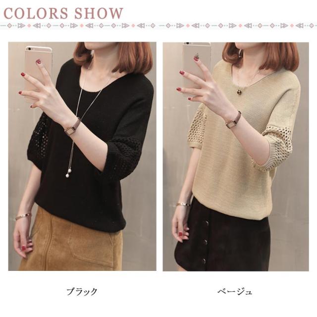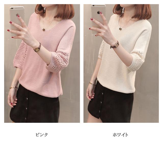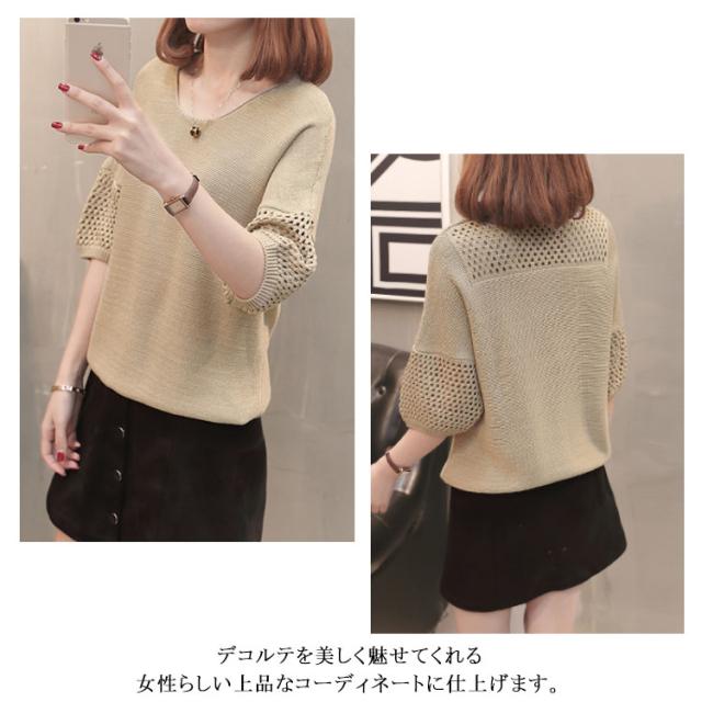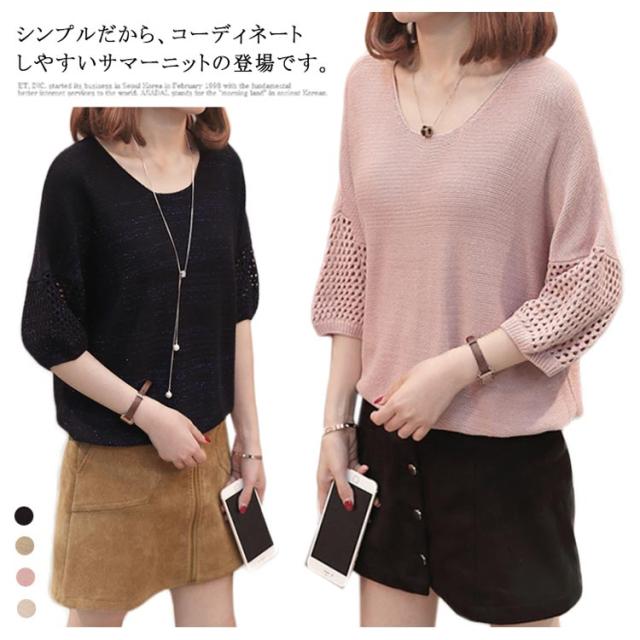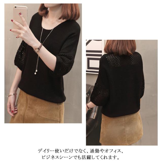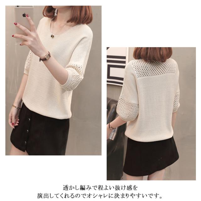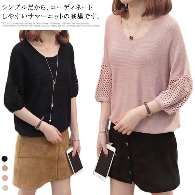 サマーニット レディース お洒落 クルーネック レディース 透かし彫り ニットソー トップス 無地 キレイめ ゆったり 春夏 5分袖