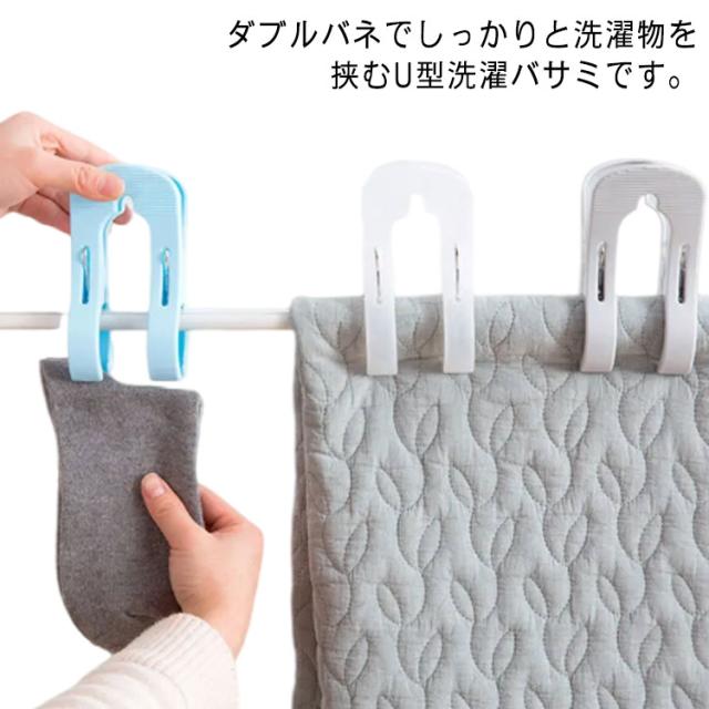 | ダブルバネでしっかりと洗濯物を挟むU型洗濯バサミです。 風が強い日などに、こちらを使用することでタオルやシーツを物干し竿にしっかり止められます。 濡れた手でも使いやすいように、つまむ部分が滑り止め加工になっています。 | |