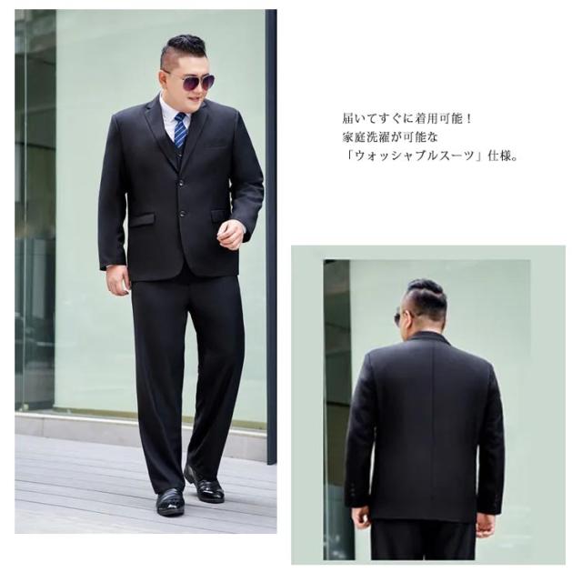 | 様々なシーンに簡単に着用できるスーツセットアップ。 届いてすぐに着用可能! 家庭洗濯が可能な「ウォッシャブルスーツ」仕様。 パンツには、ウエスト調整可能なサイドゴム入り、2〜3cm調整可能。 | |