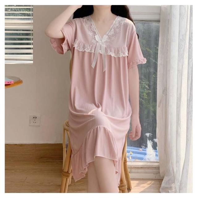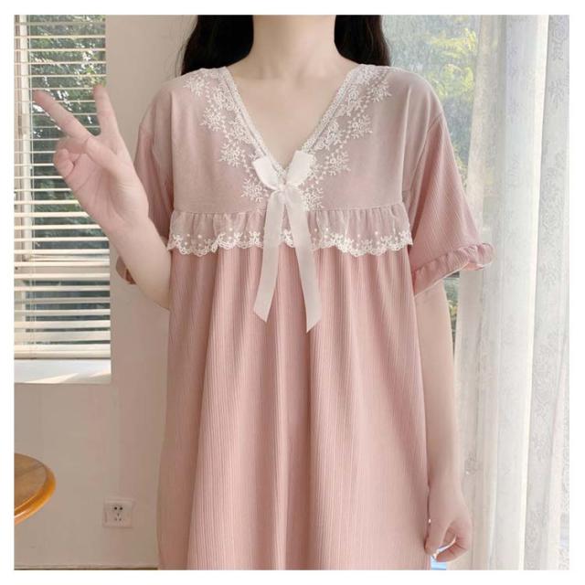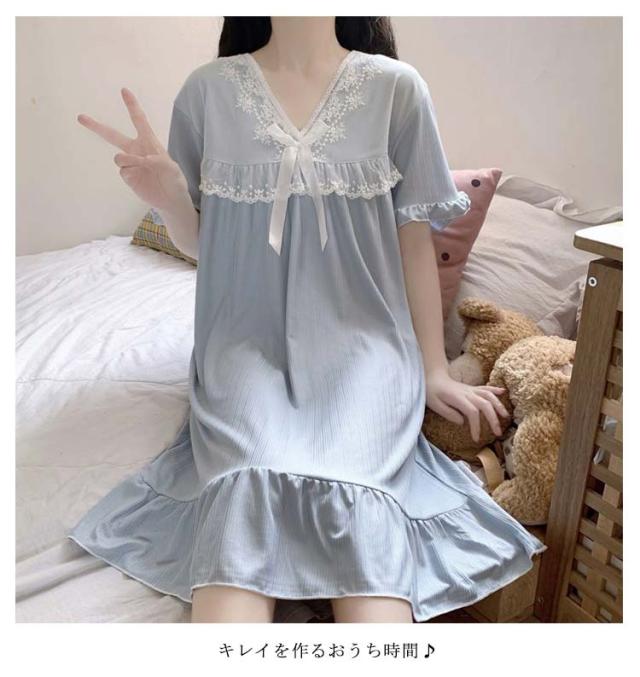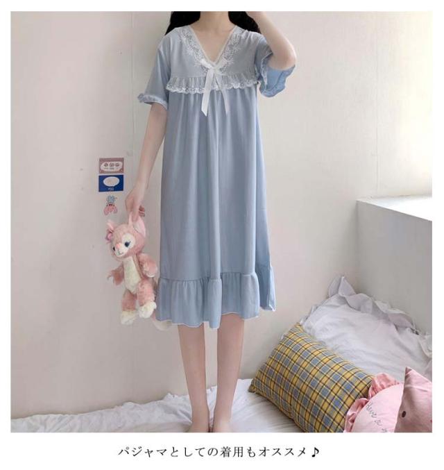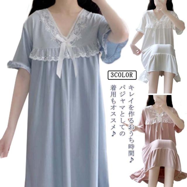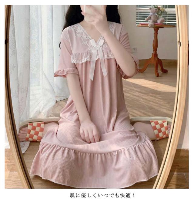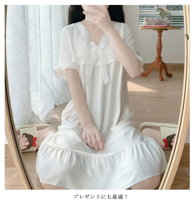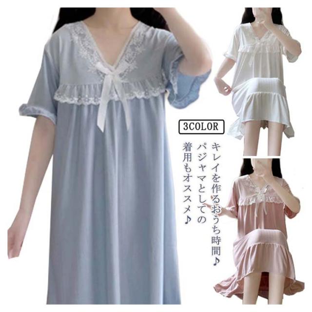 ルームウェア 夏 レディース ワンピース ルームウェア夏ワンピー パジャマ ナイトウエア 部屋着 リラックスリブ 半袖 vネック 大人可愛い レース 母 プレゼント ギフト