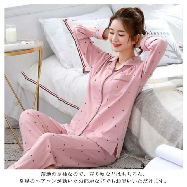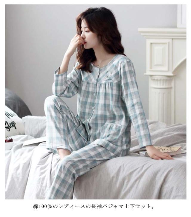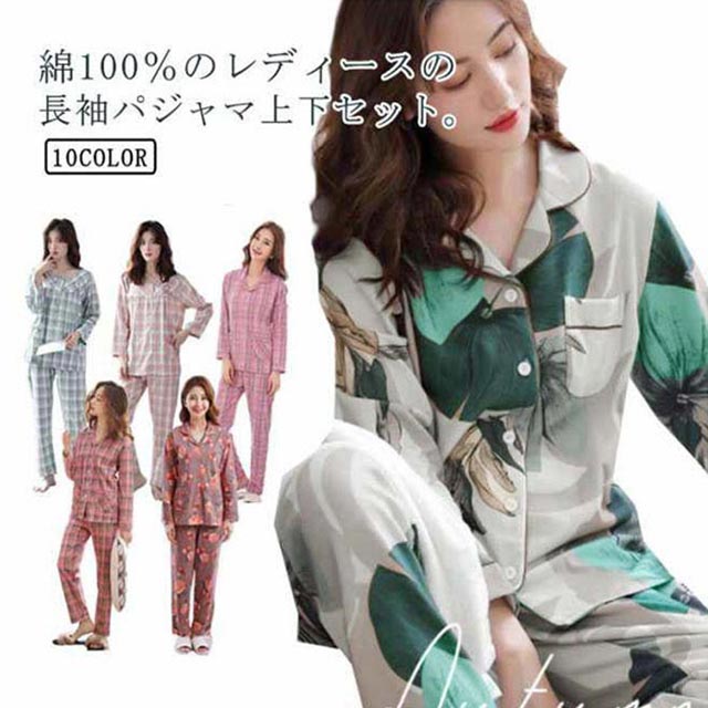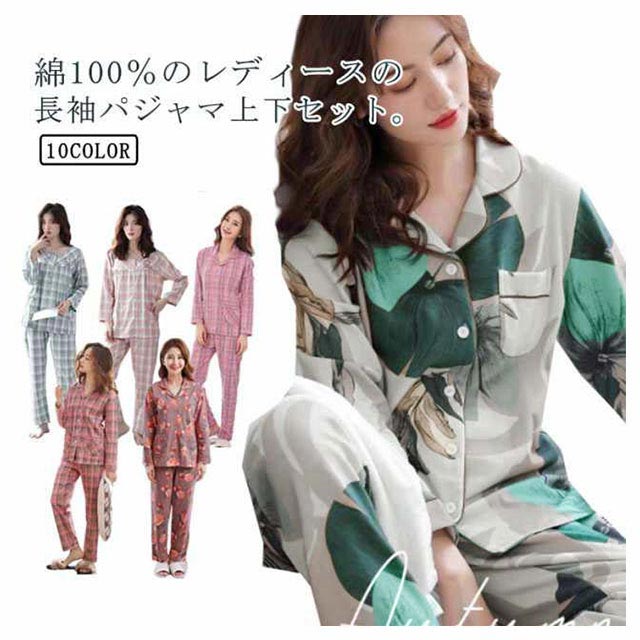 パジャマ レディース 綿100% 長袖 ルームウェア 上下セット 薄手 花柄 北欧柄 花 チェック 可愛い 前開き 春 夏 秋 涼しい 女性 コットン 部屋着 大人 かわいい おしゃれ